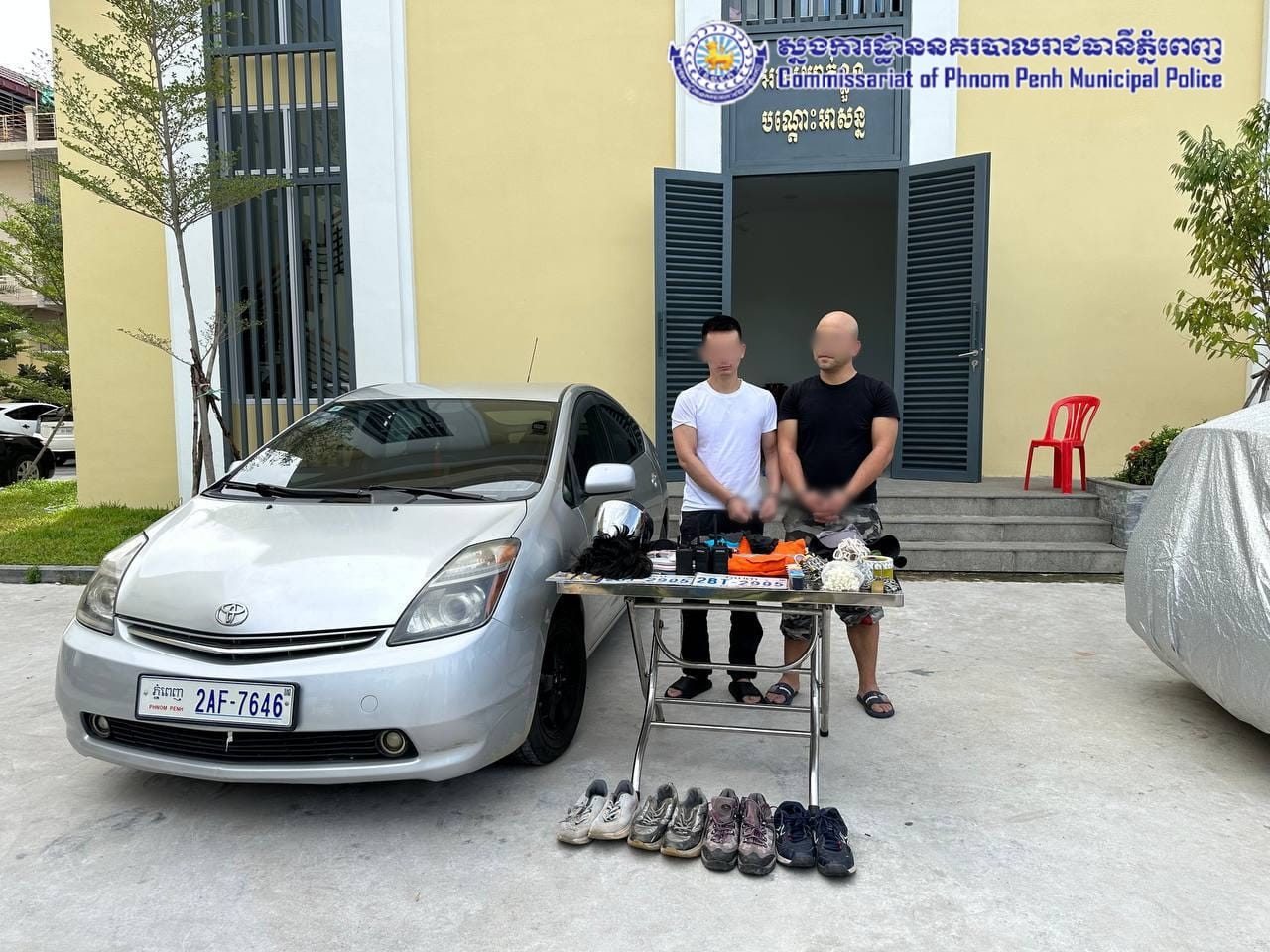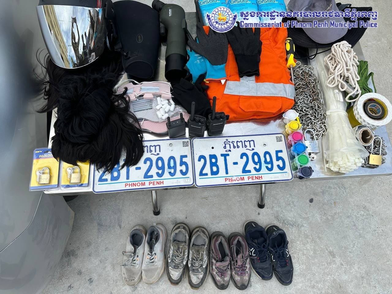 វត្ថុតាងចាប់យក៖ រថយន្តម៉ាក TOYOTA HIGHT LANDER ពណ៌ ទឹកមាស សេរីឆ្នាំ២០០៤ ពាក់ផ្លាកលេខភ្នំពេញ២AG-៤៣៧៤, រថយន្តម៉ាក TOYOTA PRIUS ពណ៌ ទឹកប្រាក់ សេរីឆ្នាំ២០០៤ លេខតួ០៥១១០៤ ពាក់ផ្លាកលេខ ភ្នំពេញ២AF-៧៦៤៦, ទូរសព្ទ័ដៃម៉ាកអាយហ្វូន ពណ៌ ប្រផេះ, ទូរសព្ទ័ដៃម៉ាកអាយហ្វូន ពណ៌ ខ្មៅ ចំនួន០២គ្រឿង, កាបូបដាក់ខោអាវ ម៉ាក MCYS& JPM ពណ៌ ខ្មៅ, អាវដៃវែង មានចំណាំងផ្លាត ពណ៌ ទឹកក្រូច សម្រាប់ធ្វើការងារនៅតាមការដ្ឋានចំនួន ០២, ស្បែកជើងប៉ាតាម៉ាកPEDRO ពណ៌ ទឹកប្រាក់ ចំនួន ០១គូ, ស្បែកជើងប៉ាតា ម៉ាកNIKE ពណ៌ស, ស្បែកជើងប៉ាតាម៉ាកSTARFOS ពណ៌ ស្វាយលាយប្រផេះ, ស្បែកជើងប៉ាតាម៉ាកARTTENGO ពណ៌ ទឹកប៊ិច, ផ្លាកលេខរថយន្តលេខភ្នំពេញ២BT-២៩៩៥ (លេខពិតភ្នំពេញ២BT-២៩០៥) ចំនួន ០២ បន្ទះ, ខ្សែរិតជ័រ ពណ៌ស មួយចំនួន, ខ្សែពណ៌ស ចំនួន ០២ ខ្សែ, ខ្សែអង្រឹងពណ៌បៃតង ចំនួន០៣ដុំ, ច្រវ៉ាកដែកចំនួន ០៤ ខ្សែ, មេសោ ចំនួន០៣, ស្រោមដៃពណ៌ខ្មៅ ចំនួន០២គូ, ស្រោមដៃពណ៌ផ្ទៃមេឃលាយខ្មៅ, វិទ្យុទាក់ទងម៉ាក BAOFENG ពណ៌ ខ្មៅ ចំនួន០២ គ្រឿង,ឧបករណ៍ផ្តាច់ប្រព័ន្ធកាមេរ៉ា, ទួណឺវីស ដងពណ៌លឿង, កែវឆ្លុះម៉ាកSAGA ជើងទម្រ និងស្រោម, ម៉ាស ចំនួន០៣ដុំ, សក់ក្លែងក្លាយ ចំនួន០៣, របាំងមុខជ័រកែច្នៃ ចំនួន០៤, មួកសុវត្ថិភាព ពណ៌ ខ្មៅ ម៉ាក BOPA កញ្ចក់មុខលាបថ្នាំពណ៌សខាងក្នុង ចំនួន០១, ស្កុតចំនួន ០៤ដុំ, ក្រដាសអាលុយមីញ៉ូម ចំនួន០១ដុំ, មួកកាតឹប ចំនួន០១, មួកឆាង ចំនួន០២, សំឡីចុកត្រចៀក ចំនួន០១ថង់, ទឹកថ្នាំដបជ័រចំនួន ០៦ដប (០៦ពណ៌), ទូរស័ព្ទដៃ ម៉ាកអាយហ្វូន ពណ៌ ខ្មៅ ចំនួន០២គ្រឿង, ច្រវ៉ាក់ដែកប្រវែង ១៤៥សង់ទីម៉ែត្រ និងសោចំនួន០១។