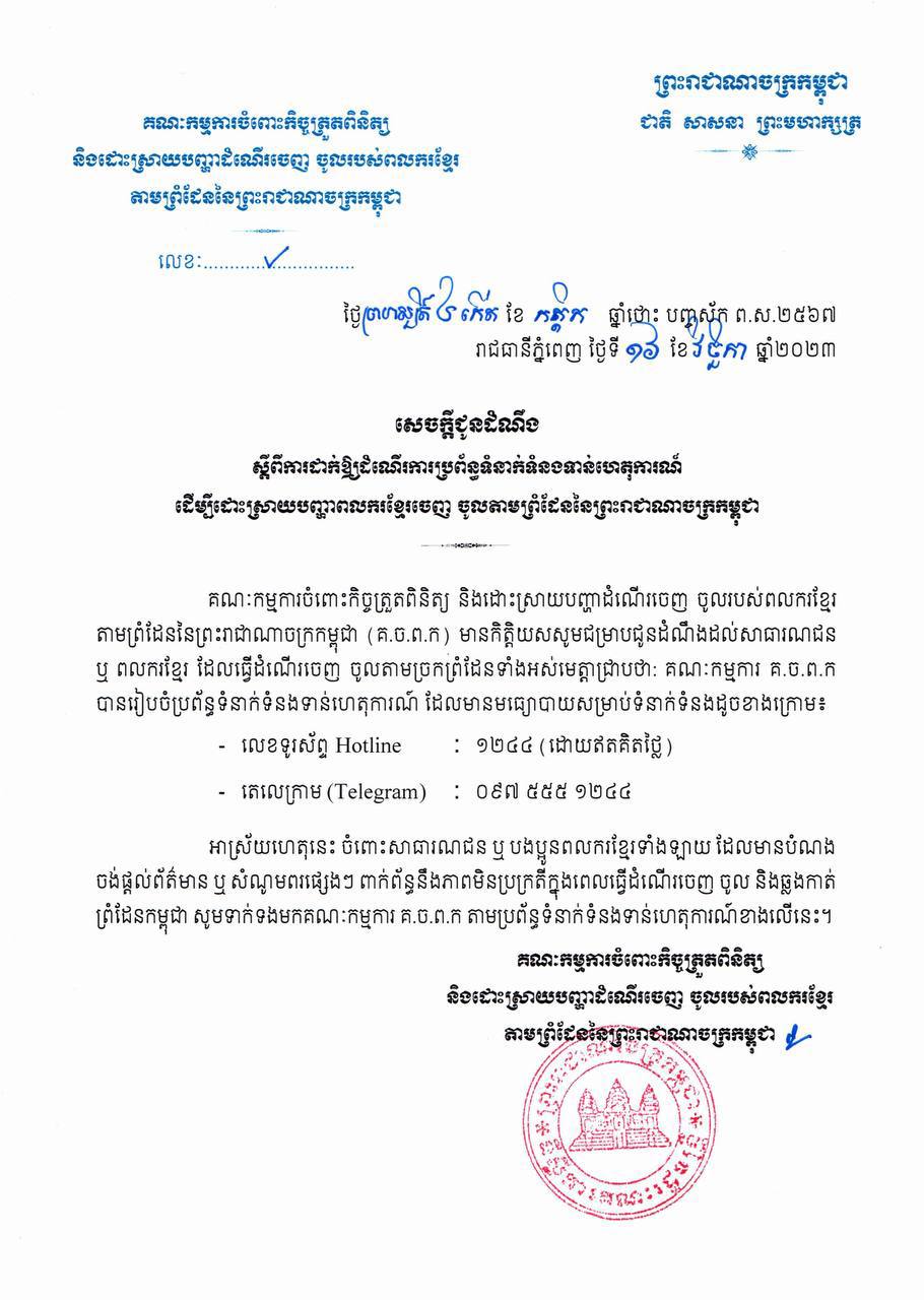 រាជធានីភ្នំពេញ៖ នៅថ្ងៃទី១៧ ខែវិច្ឆិកា ឆ្នាំ២០២៣ គណៈកម្មការចំពោះកិច្ចត្រួតពិនិត្យ និងដោះស្រាយបញ្ហាដំណើរចេញចូលរបស់ពលករខ្មែរ តាមព្រំដែននៃព្រះរាជាណាចក្រកម្ពុជា បានចេញសេចក្ដីជូនដំណឹង ស្តីពីការដាក់ឱ្យដំណើរការប្រព័ន្ធទំនាក់ទំនងទាន់ហេតុការណ៍ ដើម្បីដោះស្រាយបញ្ហាពលករខ្មែរ ចេញ-ចូល តាមព្រំដែន នៃព្រះរាជាណាចក្រកម្ពុជា។