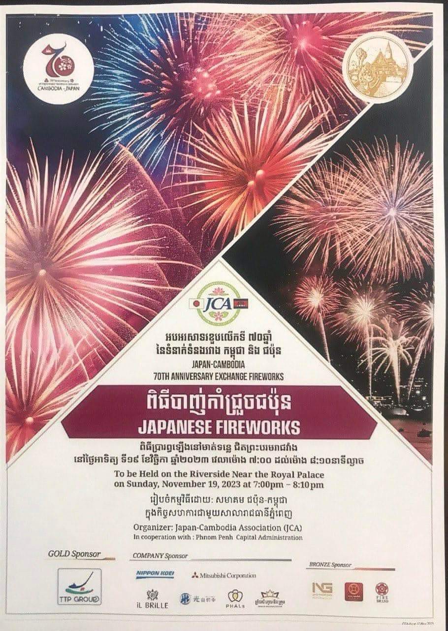 បើយោងតាមការបង្ហោះរបស់ រដ្ឋបាលខណ្ឌដូនពេញ បានបញ្ជាក់យ៉ាងដូច្នេះថា៖ នៅថ្ងៃអាទិត្យ ទី១៩ ខែវិច្ឆិកា ឆ្នាំ២០២៣ ចាប់ពីម៉ោង ១៩៖០០ – ២០៖០០យប់ នៅទីតាំងសួនច្បារមាត់ទន្លេ មុខព្រះបរមរាជវាំង ដើម្បីអបអរសាទរខួប ៧០ឆ្នាំ នៃការបង្កើតទំនាក់ទំនងការទូតរវាងកម្ពុជា-ជប៉ុន រដ្ឋាភិបាលទាំងពីរនឹងរៀបចំពិធីបាញ់កាំជ្រួច នាំចូលពីប្រទេសជប៉ុន ដែលមានភាពទាក់ទាញ និងផ្តល់ទស្សនីយភាពប្លែកៗជាច្រើន។ ដូច្នេះ សូមគោរពអញ្ចើញពុកម៉ែ អ៊ុំពូ មាមីង បងប្អូន យាយតា មកទស្សនាកុំបីខាន ៕