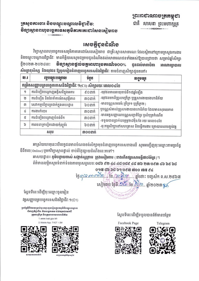 វិទ្យាស្ថានពហុបច្ចេកទេសភូមិភាគតេជោសែនសៀមរាប ដែលជាគ្រឹះស្ថានសាធារណៈស្ថិតនៅក្រោមក្រសួងការងារ និងបណ្តុះបណ្តាលវិជ្ជាជីវៈ បានប្រកាសឱ្យដឹងនាថ្ងៃទី១៧ វិច្ឆិកា ២០២៣ ថា សម្រាប់ឆ្នាំសិក្សាថ្មី ២០២៣-២០២៤ វិទ្យាស្ថាននេះផ្តល់អាហារូបករណ៍១០០ភាគរយជូនដល់យុវជនមកពីគ្រួសារក្រីក្រ និងគ្រួសារងាយរងហានិភ័យចំនួន៣០០នាក់ឱ្យចូលរៀនជំនាញបច្ចេកទេស និងវិជ្ជាជីវៈចំនួន៦ជំនាញក្នុងកម្រិតសញ្ញាបត្របច្ចេកទេសនិងវិជ្ជាជីវៈ១(C1) ដោយសិក្សារយៈពេល៤ខែ។ សិស្សនឹងចុះកម្មសិក្សានៅសហគ្រាស និងធ្វើការងារក្រោយពេលបញ្ចប់វគ្គ។