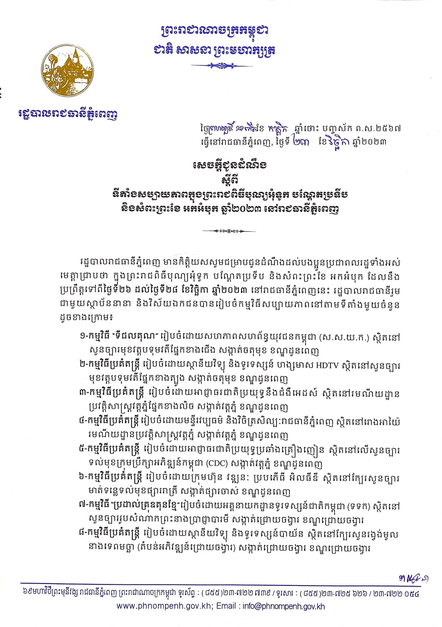 ក្នុងព្រះរាជពិធីបុណ្យអុំទូក បណ្តែតប្រទីប និងសំពះព្រះខែ អកអំបុក ដែលនឹងប្រព្រឹត្តទៅពីថ្ងៃទី២៦ ដល់ថ្ងៃទី២៨ ខែវិច្ឆិកា ឆ្នាំ២០២៣ នៅរាជធានីភ្នំពេញនេះ រដ្ឋបាលរាជធានីរួម ជាមួយស្ថាប័ននានា និងវិស័យឯកជនបានរៀបចំកម្មវិធីសប្បាយភាពនៅតាមទីតាំងមួយចំនួន ដូចខាងក្រោម៖