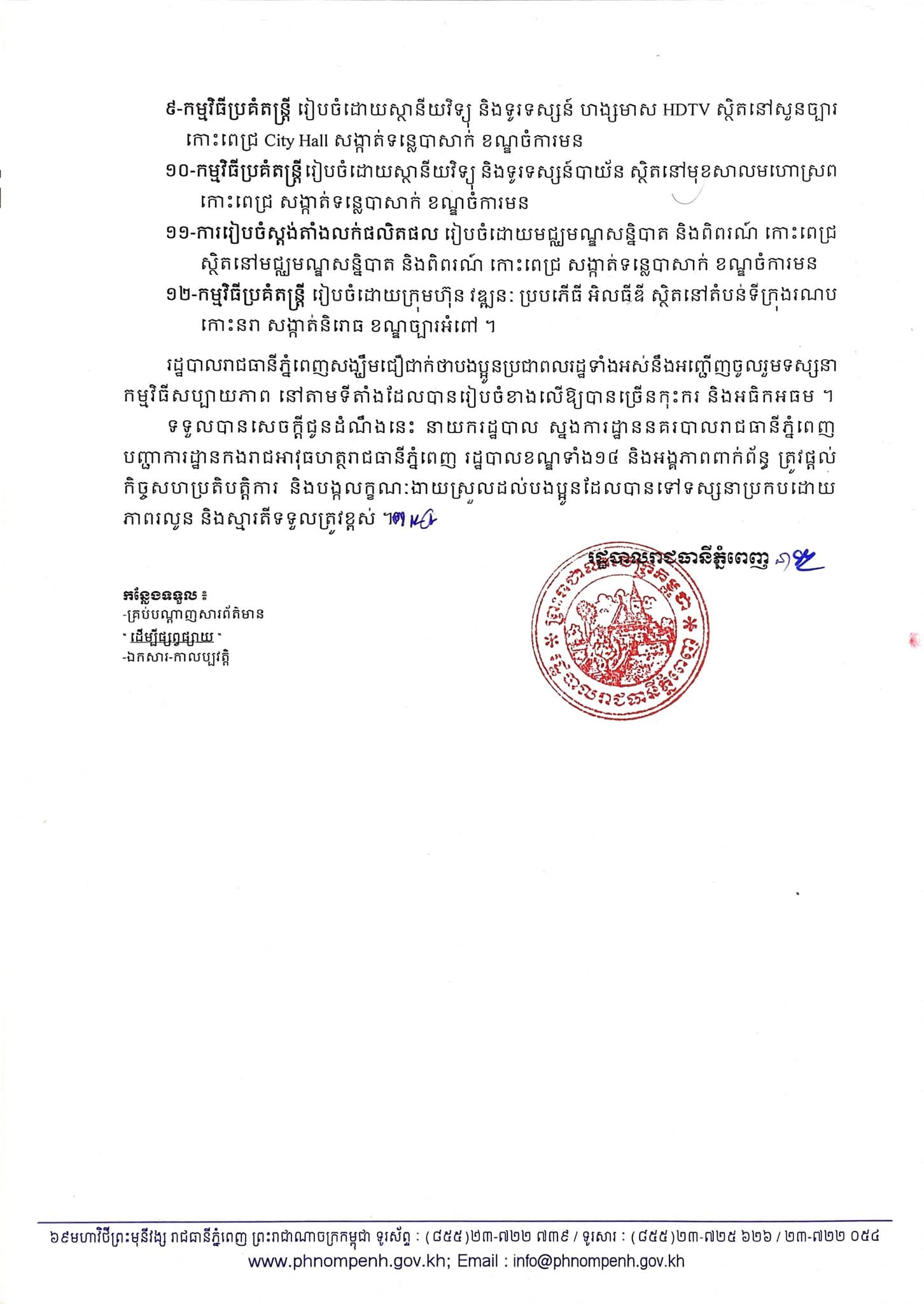 រដ្ឋបាលរាជធានីភ្នំពេញសង្ឃឹមជឿជាក់ថាបងប្អូនប្រជាពលរដ្ឋទាំងអស់នឹងអញ្ជើញចូលរួមទស្សនា កម្មវិធីសប្បាយភាព នៅតាមទីតាំងដែលបានរៀបចំខាងលើឱ្យបានច្រើនកុះករ និងអធិកអធម ៕