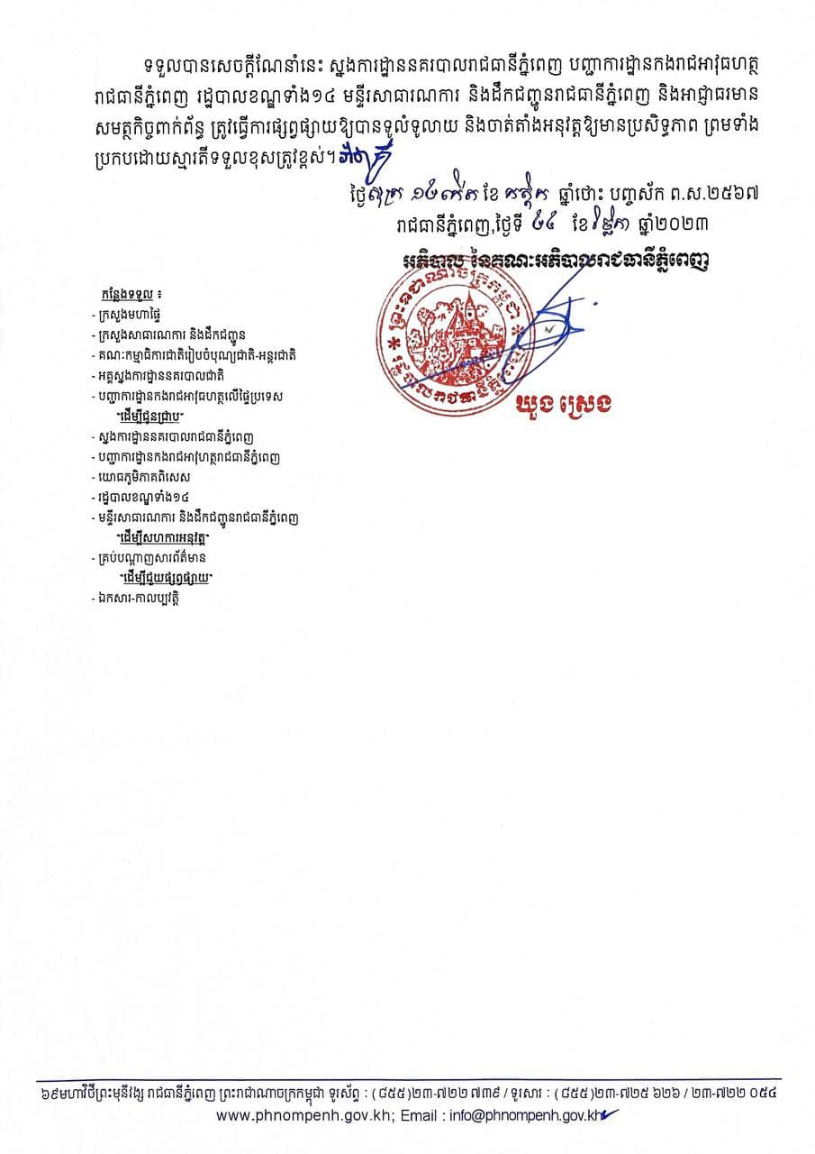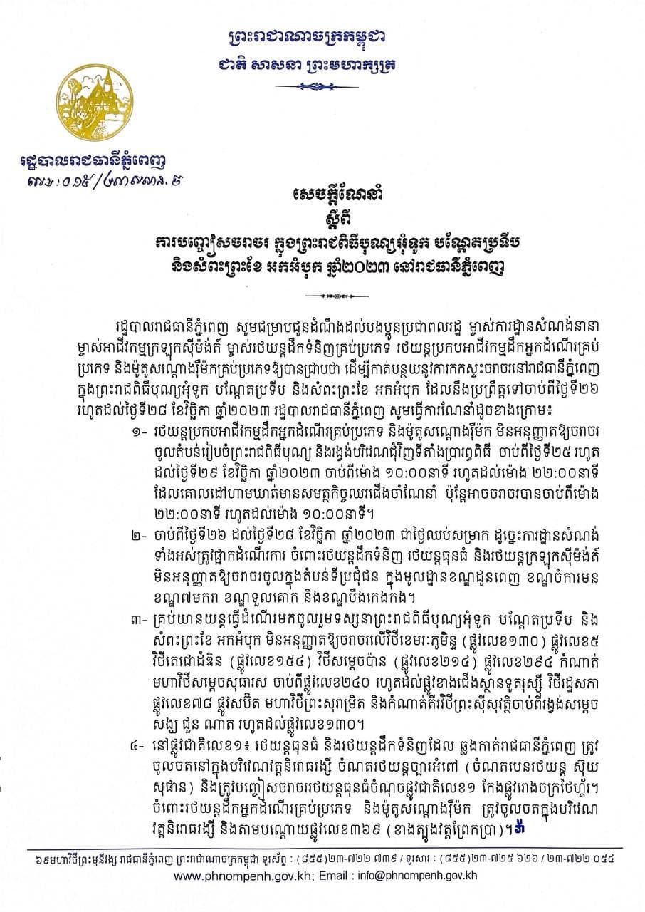 ដើម្បីកាត់បន្ថយនូវការកកស្ទះចរាចរនៅរាជធានីភ្នំពេញ ក្នុងព្រះរាជពិធីបុណ្យអុំទូក បណ្ដែតប្រទីប និងសំពះព្រះខែ អកអំបុក ដែលនឹងប្រព្រឹត្តទៅចាប់ពីថ្ងៃទី២៦ រហូតដល់ថ្ងៃទី២៨ ខែវិច្ឆិកា ឆ្នាំ២០២៣ រដ្ឋបាលរាជធានីភ្នំពេញ សូមធ្វើការណែនាំដូចខាងក្រោម៖