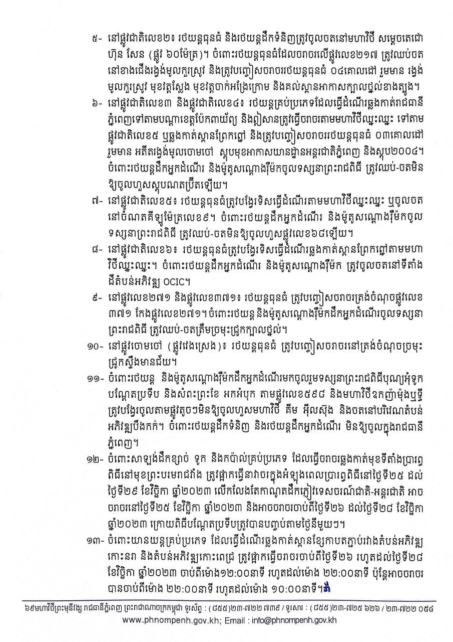 ១- រថយន្តប្រកបអាជីវកម្មដឹកអ្នកដំណើរគ្រប់ប្រភេទ និងម៉ូតូសណ្តោងរ៉ឺម៉ក មិនអនុញ្ញាតឱ្យចរាចរ ចូលតំបន់រៀបចំព្រះរាជពិធីបុណ្យ និងរង្វង់បរិវេណជុំវិញទីតាំងប្រារព្ធពិធី ចាប់ពីថ្ងៃទី២៥ រហូត ដល់ថ្ងៃទី២៩ ខែវិច្ឆិកា ឆ្នាំ២០២៣ ចាប់ពីម៉ោង ១០:០០នាទី រហូតដល់ម៉ោង ២២:០០នាទី ដែលគោលដៅហាមឃាត់មានសមត្ថកិច្ចឈរជើងចាំណែនាំ ប៉ុន្តែអាចចរាចរបានចាប់ពីម៉ោង ២២:០០នាទី រហូតដល់ម៉ោង ១០:០០នាទី។