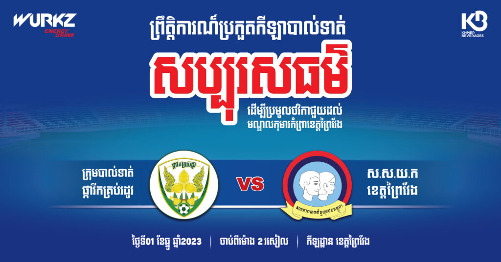 សូមបងប្អូនចូលរួមទស្សនាការប្រកួតដោយសេរីដើម្បីគាំទ្រកម្មវិធីសប្បុរសធ៌ម និងគាំទ្រភេសជ្ជៈប៉ូវកម្លាំង វើក និងគ្រប់ផលិតផលរបស់ក្រុមហ៊ុន ខ្មែរ ប៊ែវើរីជីស ដើម្បីគាំទ្រទង្វើល្អក្នុងសង្គម នៅថ្ងៃទី០១ ខែធ្នូ ឆ្នាំ២០២៣ ចាប់ពីម៉ោង២រសៀលតទៅ។
