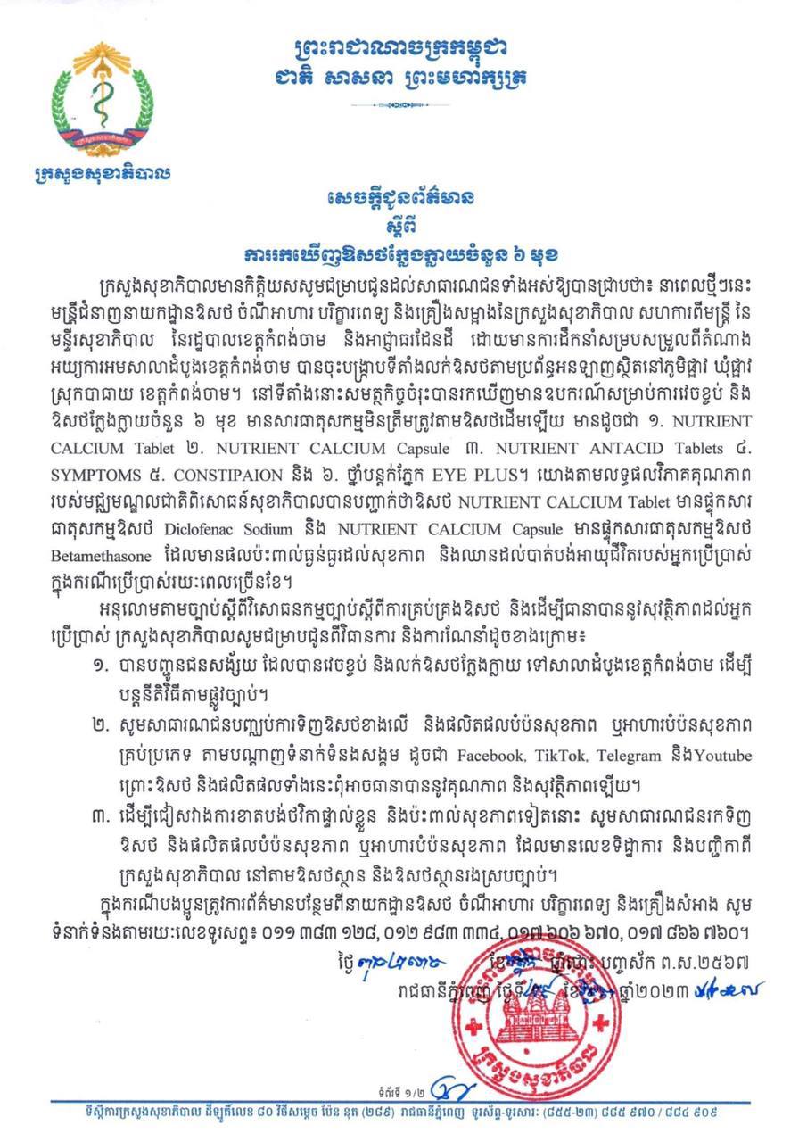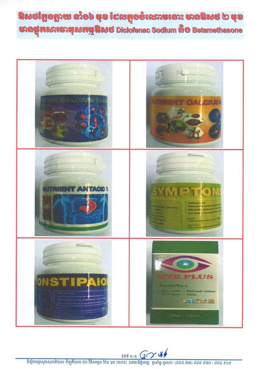យោងតាមលទ្ធផលវិភាគគុណភាព របស់មជ្ឈមណ្ឌលជាតិពិសោធន៍សុខាភិបាលបានបញ្ជាក់ថាឱសថ NUTRIENT CALCIUM Tablet មានផ្ទុកសារ ធាតុសកម្មឱសថ Diclofenac Sodium និង NUTRIENT CALCIUM Capsule មានផ្ទុកសារធាតុសកម្មឱសថ Betamethasone ដែលមានផលប៉ះពាល់ធ្ងន់ធ្ងរដល់សុខភាព និងឈានដល់បាត់បង់អាយុជីវិតរបស់អ្នកប្រើប្រាស់ ក្នុងករណីប្រើប្រាស់រយៈពេលច្រើនខែ។