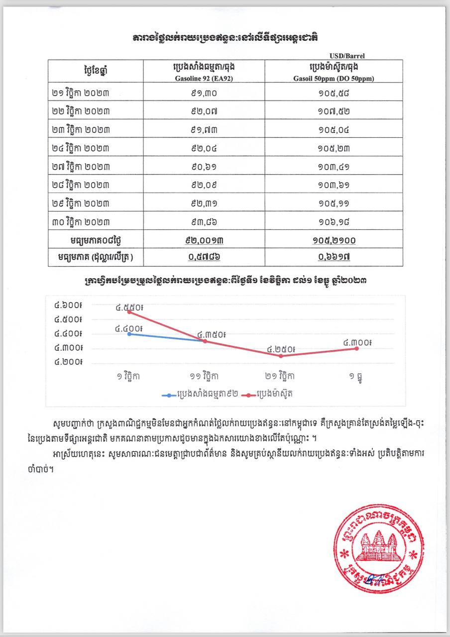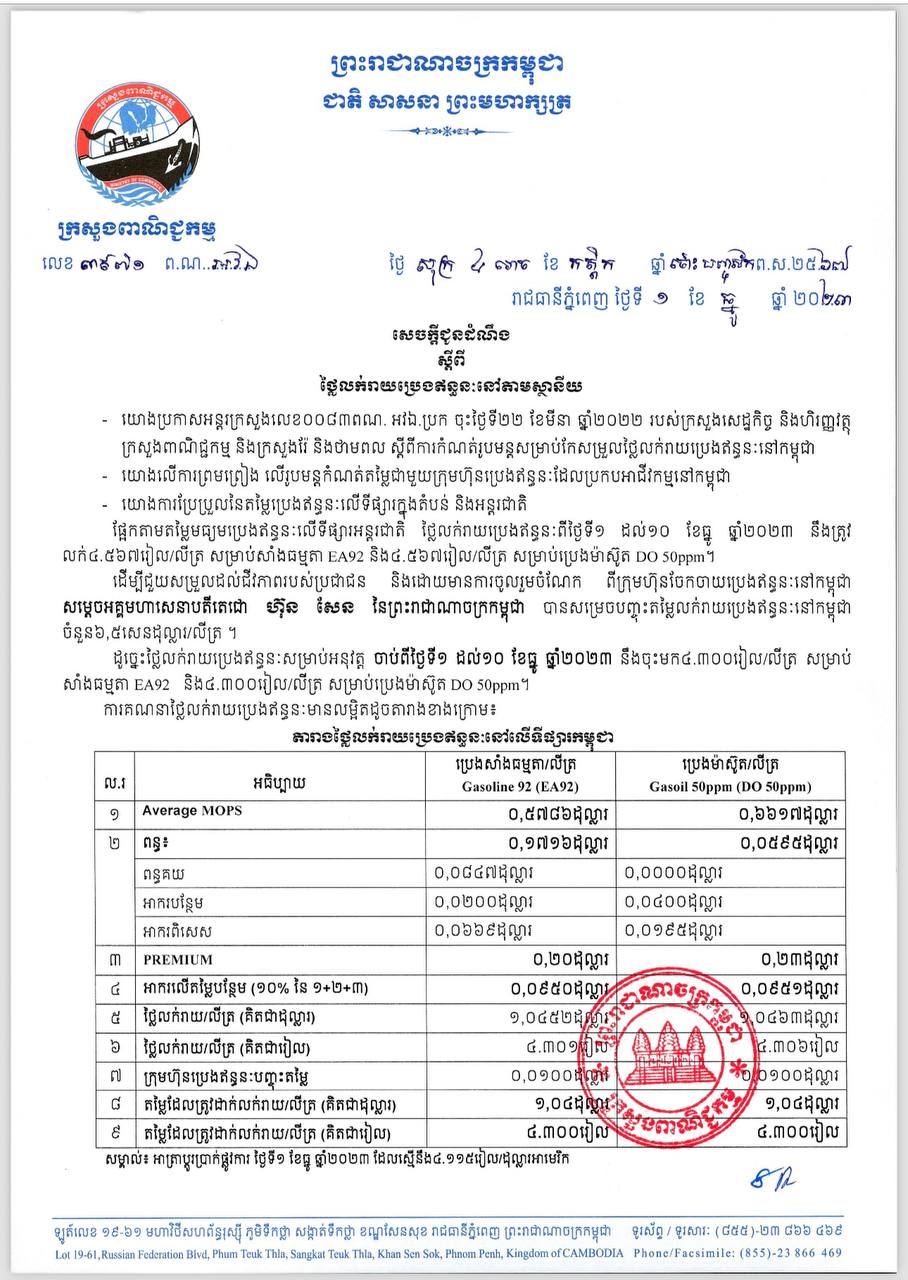 រាជធានីភ្នំពេញ៖ យោងតាមលិខិតរបស់ ក្រសួងពាណិជ្ជកម្ម ចុះផ្សាយថ្ងៃទី១ ខែធ្នូ ឆ្នាំ២០២៣ ស្តីអំពីតម្លៃលក់រាយប្រេងឥន្ធនៈនៅតាមស្ថានីយទាំងអស់ក្នុងព្រះរាជាណាចក្រកម្ពុជាសម្រាប់អនុវត្តទៅតាមតម្លៃមធ្យមប្រេងឥន្ធនៈលើទីផ្សារអន្តរជាតិ ចាប់ពីថ្ងៃទី០១ ដល់ថ្ងៃទី១០ ខែធ្នូ ឆ្នាំ២០២៣ បានឲ្យដឹងថា តម្លៃប្រេងសាំងធម្មតាមានតម្លៃ ៤,៣០០រៀលក្នុងមួយលីត្រ ចំណែកឯប្រេងសាំងម៉ាស៊ូតមានតម្លៃ ៤,៣០០រៀលក្នុងមួយលីត្រប៉ុណ្ណោះ។