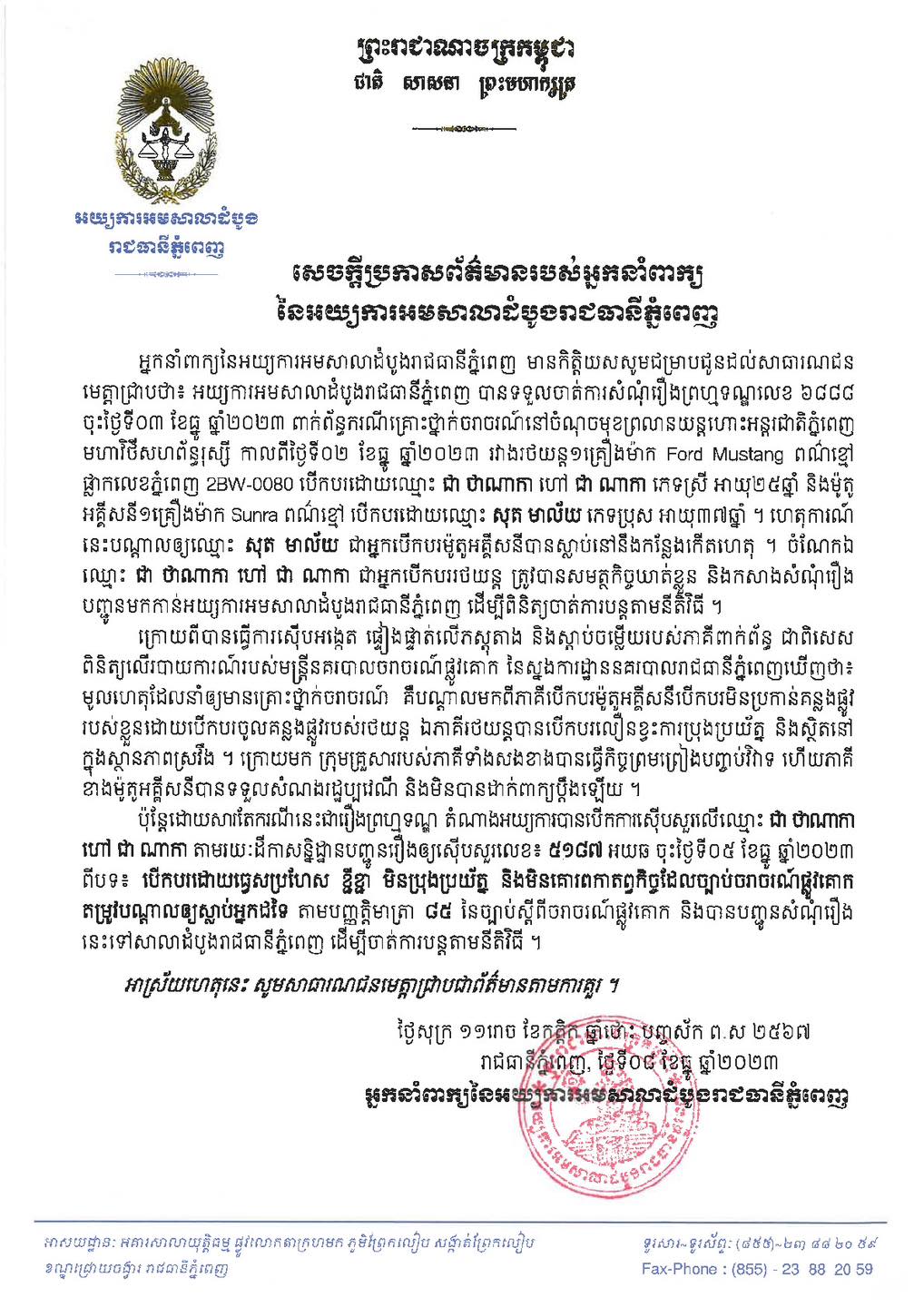 អ្នកនាំពាក្យនៃអយ្យការអមសាលាដំបូងរាជធានីភ្នំពេញ សូមជម្រាបជូនដល់សាធារណជនមេត្តាជ្រាបថា៖ អយ្យការអមសាលាដំបូងរាជធានីភ្នំពេញ បានទទួលចាត់ការសំណុំរឿងព្រហ្មទណ្ឌលេខ ៦៨៨៨ ចុះថ្ងៃទី០៣ ខែធ្នូ ឆ្នាំ២០២៣ ពាក់ព័ន្ធករណីគ្រោះថ្នាក់ចរាចរណ៍នៅចំណុចមុខព្រលានយន្តហោះអន្តរជាតិភ្នំពេញ មហាវិថីសហព័ន្ធរុស្សី កាលពីថ្ងៃទី០២ ខែធ្នូ ឆ្នាំ២០២៣ រវាងរថយន្ត១គ្រឿងម៉ាក Ford Mustang ពណ៌ខ្មៅ ផ្លាកលេខភ្នំពេញ 2BW-0080 បើកបរដោយឈ្មោះ ជា ថាណាកា ហៅ ជា ណាកា ភេទស្រី អាយុ២៥ឆ្នាំ និងម៉ូតូ អគ្គិសនី១គ្រឿងម៉ាក Sunra ពណ៌ខ្មៅ បើកបរដោយឈ្មោះ សុត មាល័យ ភេទប្រុស អាយុ៣៧ឆ្នាំ។