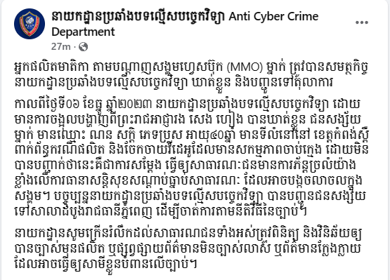 បច្ចុប្បន្ននាយកដ្ឋានប្រឆាំងបទល្មើសបច្ចេកវិទ្យា បានបញ្ជូនជនសង្ស័យទៅសាលាដំបូងរាជធានីភ្នំពេញ ដើម្បីចាត់ការតាមនីតិវិធីនៃច្បាប់។ នាយកដ្ឋានសូមក្រើនរំលឹកដល់សាធារណជនទាំងអស់ត្រូវពិនិត្យ និងវិនិច្ឆ័យឲ្យបានច្បាស់មុនផលិត ឬផ្សព្វផ្សាយព័ត៌មានមិនច្បាស់លាស់ ឬព័ត៌មានក្លែងក្លាយដែលអាចធ្វើឲ្យសាមីខ្លួនបំពានលើច្បាប់ ៕