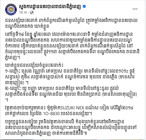 រាជធានីភ្នំពេញ៖ យោងតាមការចុះផ្សាយរបស់ ស្នងការដ្ឋាននគរបាលរាជធានីភ្នំពេញ បានឱ្យដឹងថា នៅថ្ងៃទី១៤ ខែធ្នូ ឆ្នាំ២០២៣ វេលាម៉ោង១២៖៣០នាទី កម្លាំងជំនាញអធិការដ្ឋាននគរបាលខណ្ឌបឹងកេងកង សហការជាមួយកម្លាំងអធិការដ្ឋាននគរបាលខណ្ឌចំការមន ធ្វើការឃាត់ខ្លួនជនសង្ស័យ០២នាក់ ពាក់ព័ន្ធករណីឆក់ទូរស័ព្ទដៃ នៅចំណុចមុខផ្ទះលេខ៧០ ផ្លូវ១១៣ សង្កាត់បឹងកេងកងទី៣ ខណ្ឌបឹងកេងកង រាជធានីភ្នំពេញ។