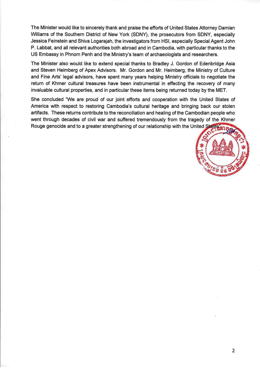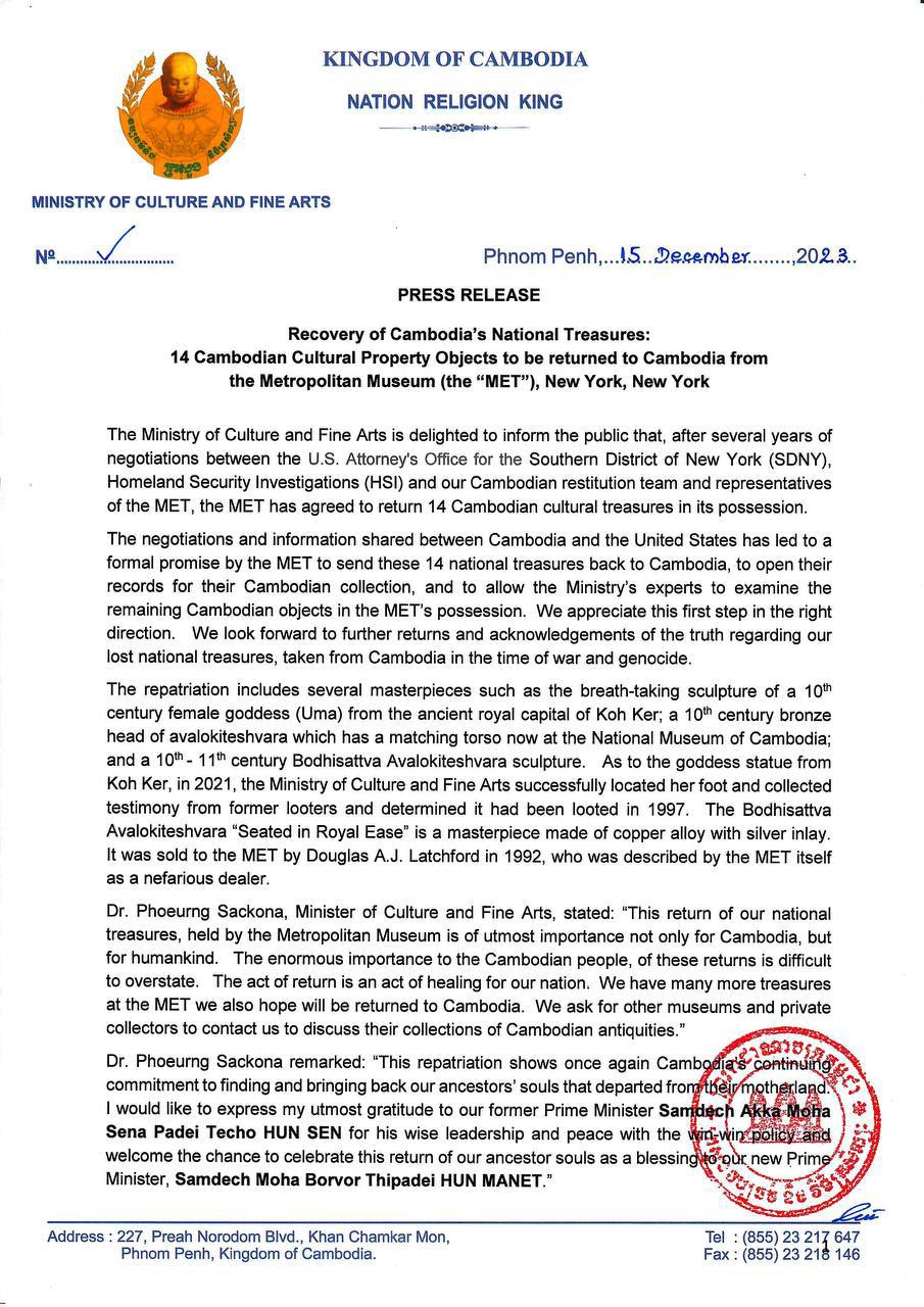 បន្ទាប់ពីការចរចាអស់រយៈពេលជាច្រើនឆ្នាំ រវាងការិយាល័យរដ្ឋអាជ្ញាសហរដ្ឋអាមេរិកប្រចាំសង្កាត់ភាគខាងត្បូងក្រុងញូវយ៉ក (SDNY), ការិយាល័យស៊ើបអង្កេតសន្តិសុខមាតុភូមិ(HSI) និងក្រុមការងារកម្ពុជា ជាមួយនឹងសារមន្ទីរ MET, វត្ថុបុរាណខ្មែរចំនួន ១៤រូប នៃសមុច្ច័យរបស់សារមន្ទីរ MET នឹងត្រូវប្រគល់ត្រឡប់មកកម្ពុជាវិញ។ តាមរយៈកិច្ចសហការ និងការចែករំលែកព័ត៌មានរវាងក្រុមការងារកម្ពុជា និងសមត្ថកិច្ចសហរដ្ឋ អាមេរិក សារមន្ទីរ MET បានផ្ដល់ការសន្យាជាផ្លូវការមួយ ក្នុងការបញ្ជូនត្រឡប់មកកម្ពុជាវិញនូវវត្ថុបុរាណ ខ្មែរចំនួន១៤រូបនេះ, ការអនុញ្ញាតឱ្យមន្ត្រីជំនាញកម្ពុជា ធ្វើកោសល្យវិច្ច័យសម្បត្តិវប្បធម៌ខ្មែរដទៃទៀត និងការពិនិត្យសិក្សាឯកសារនានាពាក់ព័ន្ធនឹងសមុច្ច័យរបស់កម្ពុជា។ យើងសូមវាយតម្លៃខ្ពស់ចំពោះលទ្ធផល ជំហានដំបូងក្នុងទិសដៅដ៏ត្រឹមត្រូវនេះ និងទន្ទឹងរង់ចាំនៃការវិលត្រឡប់មកវិញនូវសម្បត្តិវប្បធម៌ខ្មែរ បន្ថែមទៀត។