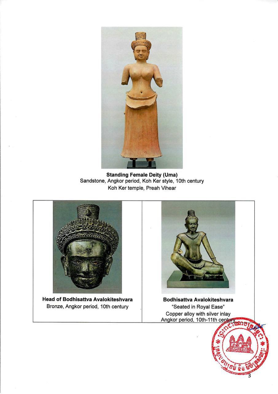 ក្នុងចំណោមវត្ថុទាំង១៤រូបដែលត្រូវបញ្ជូនមកកម្ពុជាវិញនេះ រួមមានស្នាដៃឯកមួយចំនួន ដូចជា រូបចម្លាក់ទេពស្រី (ព្រះនាងឧមា) ធ្វើពីថ្មភក់ សតវត្សរ៍ទី១០ ដែលតាមភស្តុតាងពីសាក្សី ត្រូវបានលួចយក នៅឆ្នាំ១៩៩៧ ដោយប្រអប់ជើងជាប់ជាមួយជើងទម្របដិមានេះ បានរកឃើញតាមរយៈការធ្វើកំណាយ នៅឆ្នាំ២០២១ នៅក្នុងរមណីយដ្ឋានអតីតរាជធានីកោះកេរ, ព្រះកេសព្រះលោកេសូរ ធ្វើពីសំរឹទ្ធ សតវត្សរ៍ទី ១០ ដែលដងខ្លួនបដិមាស្ថិតនៅសារមន្ទីរជាតិភ្នំពេញ និងបដិមាព្រះលោកេសូរ ធ្វើពីសំលោហៈ ដែលសារមន្ទីរ MET បានទិញពីលោក ឌូគ្លាស ឡាដហ្វដ (Douglas Latchford) នៅឆ្នាំ១៩៩២ ៕ សូមអានសេចក្ដីជូនព័ត៌មានលម្អិត ដូចខាងក្រោម៖