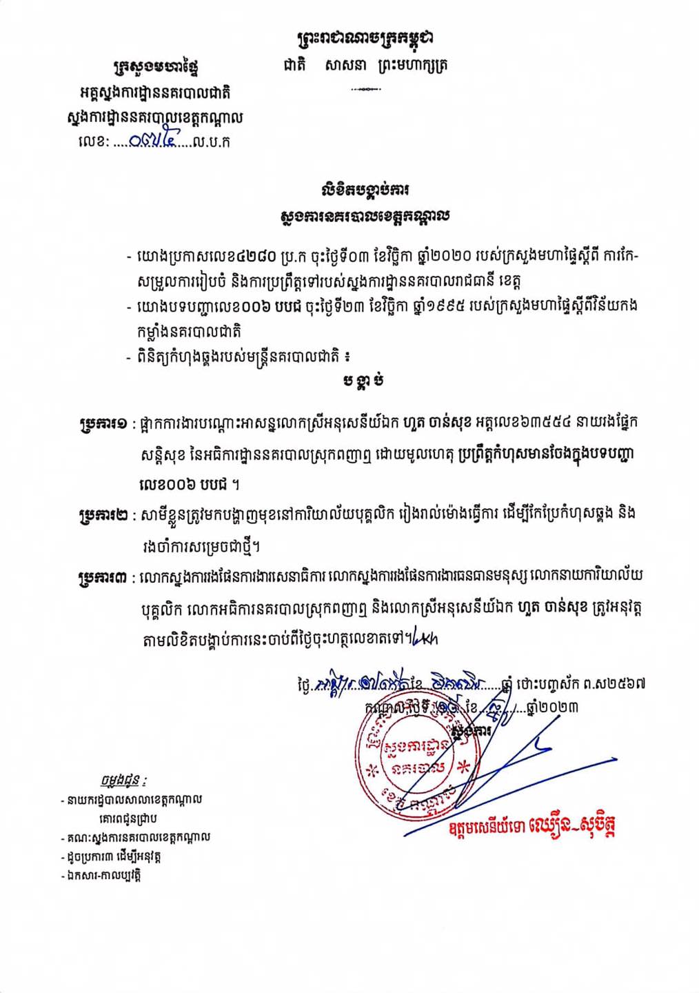 លោកឧត្តមសេនីយ៍ទោស្នងការ បានចំណាត់ការចំពោះលោកស្រីអនុសេនីយ៍ឯក ហួត ចាន់សុខ អត្តលេខ៦៣៥៥៤ នាយរងផ្នែកសន្តិសុខ នៃអធិការដ្ឋាននគរបាលស្រុកពញាឮ ផ្អាកការងារបណ្តោះអាសន្ន មូលហេតុ ប្រព្រឹត្តកំហុសមានចែងក្នុងបទបញ្ជាលេខ០០៦ បបជ។ អាស្រ័យហេតុនេះ សូមសាធារណជន និងបណ្តាញសារព័ត៌មានមេត្ដាជ្រាប៕