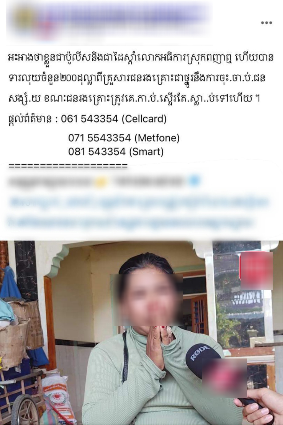 ឈ្មោះ ហួត ចាន់សុខ ពិតជាបានទារប្រាក់ពីឈ្មោះ ឈៀង សំ ចំនួន២០០ដុលា្លរ (ពីររយដុល្លារ) តាមរយៈគណនីABA ឈ្មោះ Hout Chansok ជាថ្នូរនឹងការតាមចាប់ជនល្មើស និងបានសរសេរពាក្យបណ្តឹងថ្មី ឲ្យជនរងគ្រោះយកទៅដាក់នៅអធិការដ្ឋាននគរបាលស្រុក។ នៅថ្ងៃទី២៤ ខែវិច្ឆិកា ឆ្នាំ២០២៣ វេលាម៉ោង០៨និង២៤នាទី ឈ្មោះ ហួត ចាន់សុខ បានតេទៅឈ្មោះ ឈៀង សំ តាមរយៈលេខទូរស័ព្ទ ០១២-២៩៣ ៤៥៧ ទារប្រាក់ចំនួន៣០០ដុល្លារ (បីរយដុល្លារ) បន្ថែមទៀត ដើម្បីធ្វើសោហ៊ុយទៅចាប់ជនដៃដល់ តែឈ្មោះ ឈៀង សំ មិនមានលទ្ធភាពរកប្រាក់បន្ថែមចំនួន៣០០ដុល្លារឡើយ ទើបឲ្យបណ្តាញគេហទំព័រហ្វេសប៊ុកព័ត៌មានក្នុងស្រុក បង្ហោះក្នុងបណ្តាញសង្គមហ្វេសប៊ុកដោយមានខ្លឹមសារដូចខាងលើប្រាកដមែន។