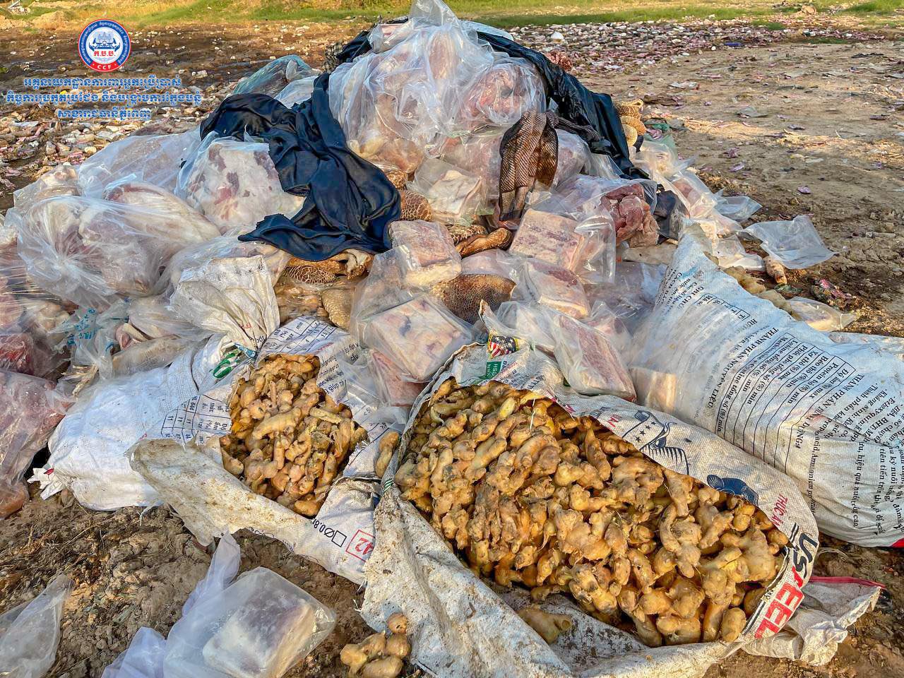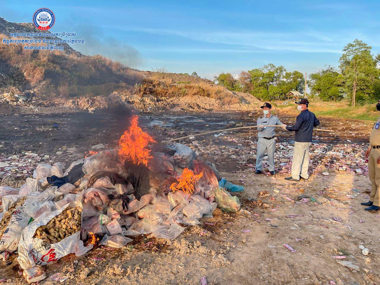 មន្ត្រីជំនាញ ក.ប.ប ដុតបំផ្លាញចោលសាច់បង្កក មើមខ្ញី និងខ្ញីហាន់មានលាយសារធាតុគីមីប្រមាណ ២,៤០០គីឡូក្រាម
