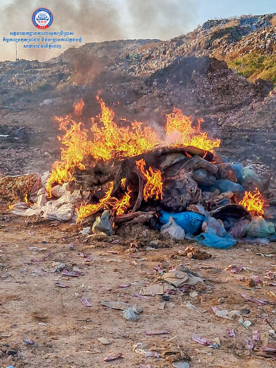 រាជធានីភ្នំពេញ៖ យោងតាមការចុះផ្សាយរបស់ អគ្គ.ការពារអ្នកប្រើប្រាស់ កិច្ចការប្រកួតប្រជែង និងបង្ក្រាបការក្លែងបន្លំ បានឱ្យដឹងថា នៅរសៀលថ្ងៃទី១៨ ខែធ្នូ ឆ្នាំ២០២៣ ក្រោមការចង្អុលបង្ហាញពីសំណាក់ ឯកឧត្តម ផាន អូន ប្រតិភូរាជរដ្ឋាភិបាល ទទួលបន្ទុកជាអគ្គនាយក នៃអគ្គនាយកដ្ឋាន ក.ប.ប. មន្ត្រីសាខា ក.ប.ប. រាជធានីភ្នំពេញ បានប្រារព្ធពិធីដុតកម្ទេចចោលនូវ សាច់បង្កក មើមខ្ញី និងខ្ញីហាន់រួច ដែលខូចគុណភាព កង្វះអនាម័យ មិនអនុលោមតាមបទប្បញ្ញត្តិបច្ចេកទេស និងមានការត្រាំនូវសារធាតុគីមី Sodium Hydrosulfite ដែលមន្ត្រីជំនាញបង្រ្កាបបាននាពេលថ្មីៗនេះ។
