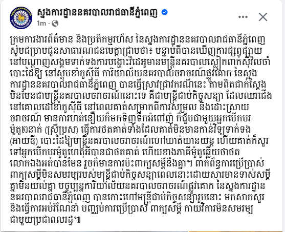 ស្នងការដ្ឋាននគរបាលរាជធានីភ្នំពេញ សូមជម្រាបជូនសាធារណជនមេត្តាជ្រាបថា៖ បន្ទាប់ពីបានឃើញការផ្សព្វផ្សាយនៅបណ្តាញសង្គមទាក់ទងការបង្ហោះវិដេអូមានមន្ត្រីនគរបាលស្លៀកពាក់ស៊ីវិលចាំបោះដៃឱ្យ នៅស្តុបខាំកូស៊ីធី ការិយាល័យនគរបាលចរាចរណ៍ផ្លូវគោក នៃស្នងការដ្ឋាននគរបាលរាជធានីភ្នំពេញ បានធ្វើស្រាវជ្រាវករណីនេះ តាមពិតជាក់ស្តែងមិនមែនជាមន្ត្រីនគរបាលចរាចរណ៍នោះទេ គឺជាមន្ត្រីជាប់កិច្ចសន្យា ដែលឈរជើងនៅគោលដៅខាំកូស៊ីធី នៅពេលគាត់សម្រាកពីការសម្រួល និងដោះស្រាយចរាចរណ៍ មានការហត់នឿយក៏មកទិញទឹកអំពៅញ៉ាំ ក៏ជួបជាមួយអ្នកបើកបរម៉ូតូ២នាក់ (ស្រីប្រុស) ធ្វើការថតគាត់ទាំងដែលគាត់មិនមានកាន់វិទ្យុទាក់ទង (អាយឌី) បោះដៃឱ្យមន្ត្រីនគរបាលចរាចរណ៍ហៅឃាត់យានយន្ត ហើយគាត់ក៏សួរទៅអ្នកបើកបរម៉ូតូហេតុអីបានជាថតគាត់ ហើយខាងភាគីម៉ូតូឆ្លើយថាថតលោកឯងអត់បានមែន រួចក៏មានការប៉ះពាក្យសម្តីនឹងគ្នា។