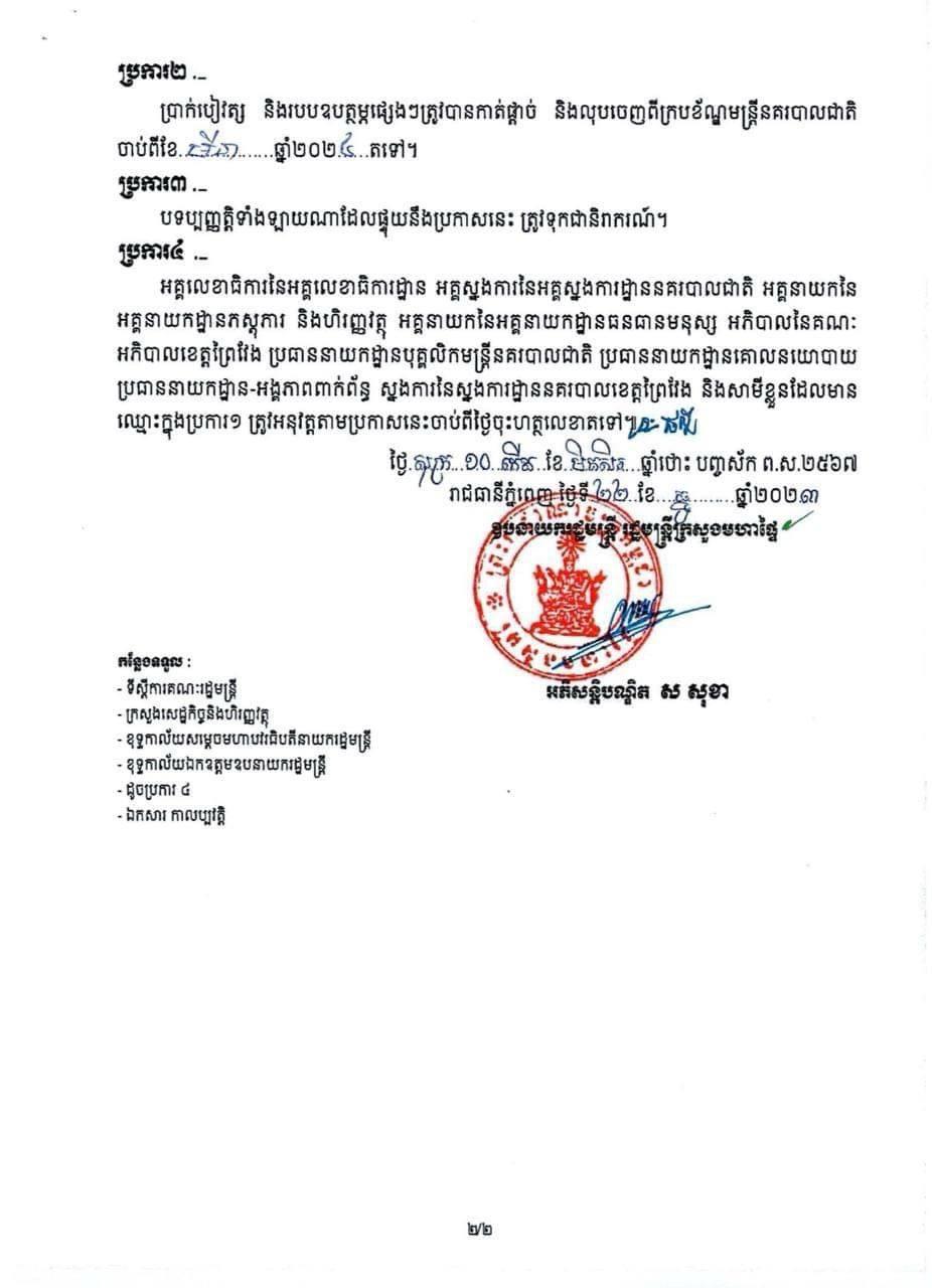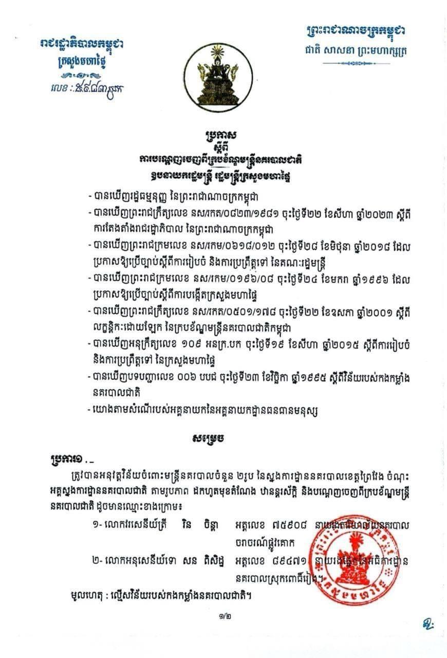 ក្នុងប្រកាសបណ្ដេញចេញបញ្ជាក់ថា មន្ដ្រីនគរបាលជាតិទាំង១១នាក់ ដែលក្រសួងមហាផ្ទៃបណ្ដេញចេញពីក្របខ័ណ្ឌនេះ ជាកម្លាំងស្ថិតក្រោមឱវាទស្នងការដ្ឋាននគរបាលខេត្តព្រៃវែង និងចំណុះអគ្គស្នងការដ្ឋាននគរបាលជាតិ ក្រសួងមហាផ្ទៃ។