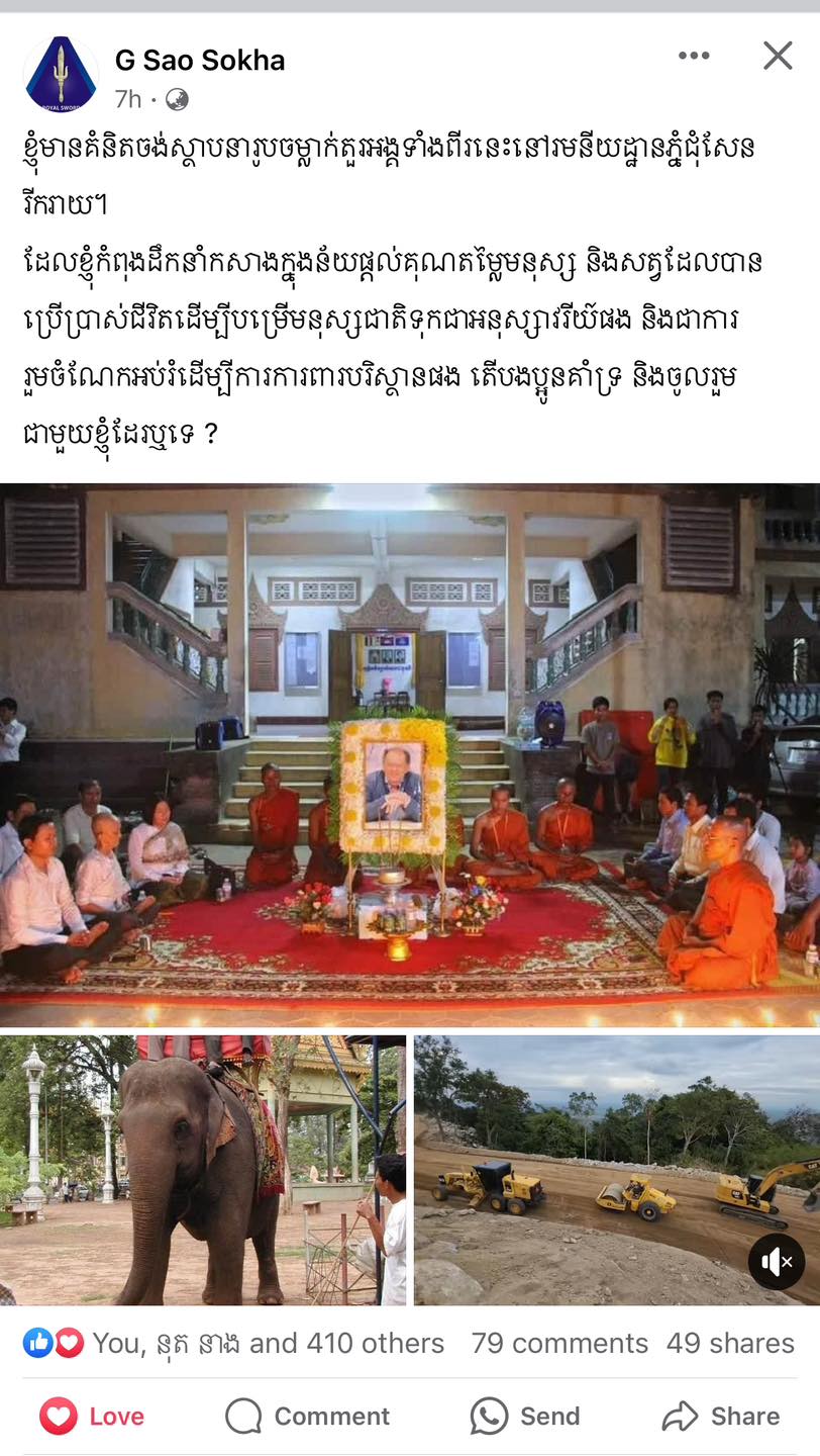 តាមរយៈខ្លឹមសារបង្ហោះរបស់ នាយឧត្តមសេនីយ៍ សៅ សុខា បានសរសររៀបរាប់យ៉ាងដូច្នេះថា៖ « ខ្ញុំមានគំនិតចង់ស្ថាបនារូបចម្លាក់តួរអង្គទាំងពីរនេះនៅរមណីយដ្ឋានភ្នំជុំសែនរីករាយ។ ដែលខ្ញុំកំពុងដឹកនាំកសាងក្នុងន័យផ្តល់គុណតម្លៃមនុស្ស និងសត្វដែលបានប្រើប្រាស់ជីវិតដើម្បីបម្រើមនុស្សជាតិទុកជាអនុស្សាវរីយ៍ផង និងជាការរួមចំណែកអប់រំដើម្បីការពារបរិស្ថានផង តើបងប្អូនគាំទ្រ និងចូលរួមជាមួយខ្ញុំដែរឬទេ?» បន្ទាប់ពីបានបង្ហោះខ្លឹមសារយ៉ាងដូច្នេះរួច គឺឃើញថាមានបងប្អូនប្រជាពលរដ្ឋជាច្រើនបានចូលទៅខមិនគ្រាំទ្រយ៉ាងពេញទំហឹង និងសប្បាយរីករាយក្រៃលែង នៅគំនិតផ្ដួចផ្ដើមនេះផងដែរ ៕