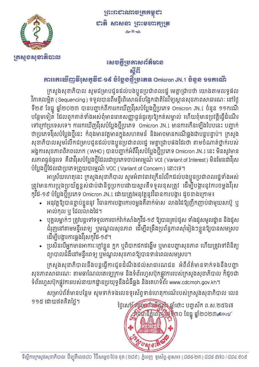 រាជធានីភ្នំពេញ៖ នៅថ្ងៃទី៣០ ខែធ្នូ ឆ្នាំ២០២៣ យោងតាមការចុះផ្សាយរបស់ ក្រសួងសុខាភិបាល បានចេញសេចក្តីប្រកាសព័ត៌មាន ស្តីពីការរកឃើញវីរុសកូវីដ-១៩ បំប្លែងថ្មីប្រភេទ Omicron JN.1 ចំនួន ១១ករណី។