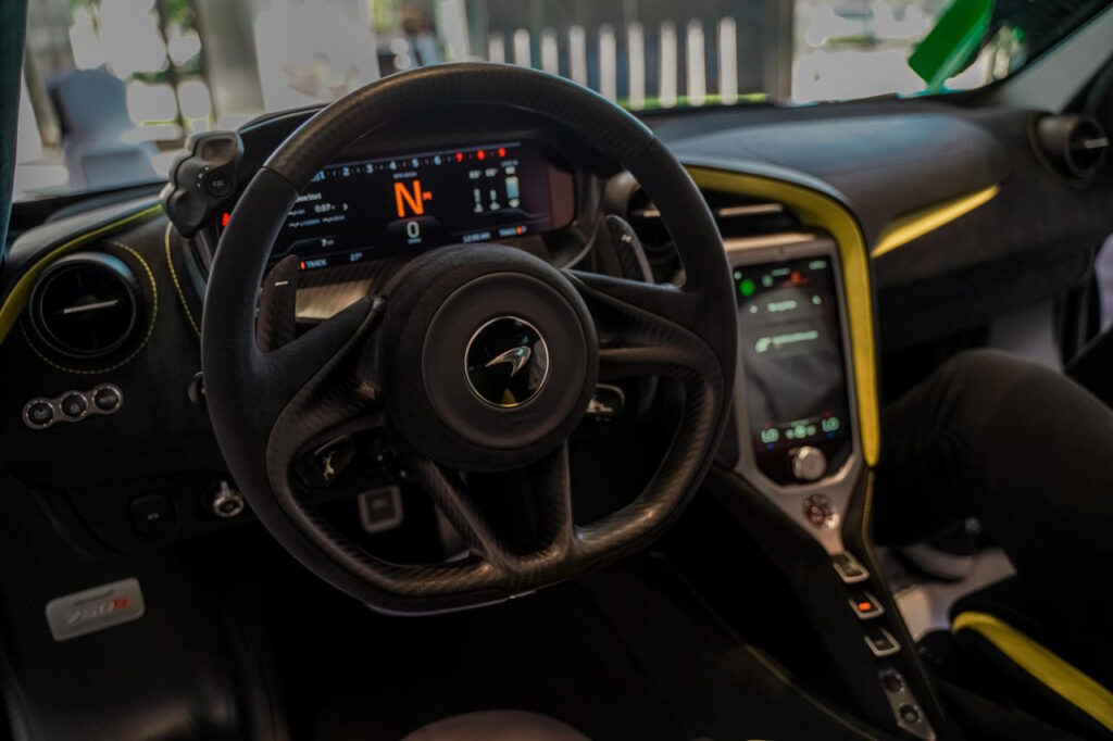 Inside the 750S, innovation meets luxury. The driver-centric design introduces a new instrument display mounted on the steering column, allowing seamless control of Active Dynamic settings. Technological features such as Apple CarPlay®, McLaren Control Launcher, and USB-C and USB-A ports enhance connectivity and convenience.