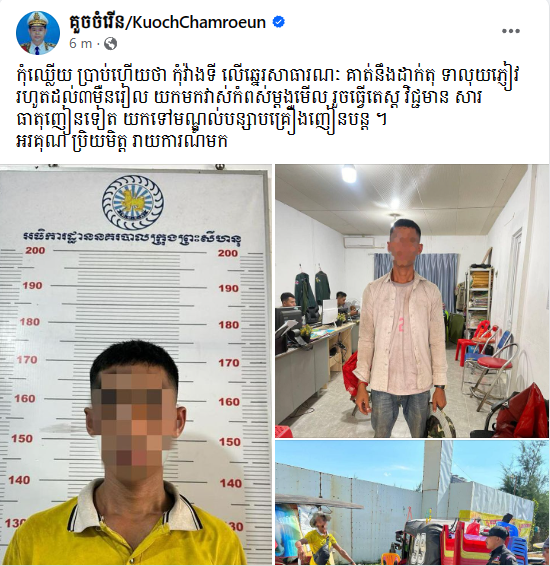 ខេត្តព្រះសីហនុ៖ នៅថ្ងៃទី០២ ខែមករា ឆ្នាំ២០២៤ យោងតាមគណនីហ្វេសប៊ុកផ្ទាល់របស់ ឯកឧត្តម គួច ចំរើន អភិបាលខេត្តព្រះសីហនុ បានឱ្យដឹងថា បុរសម្នាក់ត្រូវបានឃាត់ខ្លួន យកមកវាស់កំពស់ នៅអធិការដ្ឋាននគរបាលក្រុងព្រះសីហនុ បន្ទាប់ពីបានវាទទីលើឆ្នេរសាធារណៈ ដាក់តុ ទារលុយពីភ្ញៀវទេសចរ រហូតដល់ ៣ម៉ឺនរៀល។
