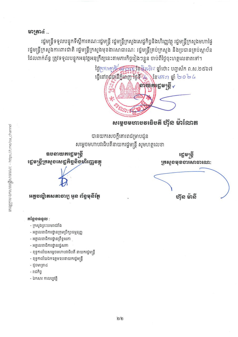 រាជធានីភ្នំពេញ៖ នៅថ្ងៃទី០៥ ខែមករា ឆ្នាំ២០២៤ សម្ដេចមហាបវរធិបតី ហ៊ុន ម៉ាណែត នាយករដ្ឋមន្ត្រីនៃព្រះរាជាណាចក្រកម្ពុជា បានចេញអនុក្រឹត្យដំឡើងប្រាក់កម្រៃប្រចាំខែជូនមន្ត្រីជាប់កិច្ចសន្យាពី ៧១ម៉ឺនរៀល ទៅ ៧៧ម៉ឺនរៀល។