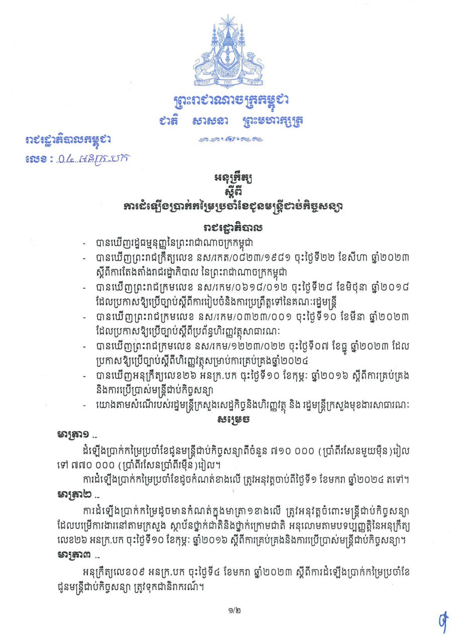 រាជរដ្ឋាភិបាលកម្ពុជា សម្រេចដំឡើងប្រាក់កម្រៃប្រចាំខែជូនមន្ត្រីជាប់កិច្ចសន្យាពីចំនួន ៧១០ ០០០ (ប្រាំពីរសែនមួយម៉ឺន) រៀល ទៅ ៧៧០ ០០០ (ប្រាំពីរសែនប្រាំពីរម៉ឺន) រៀល។ ការដំឡើងប្រាក់កម្រៃប្រចាំខែដូចកំណត់ខាងលើ ត្រូវអនុវត្តចាប់ពីថ្ងៃទី១ ខែមករា ឆ្នាំ២០២៤ តទៅ។