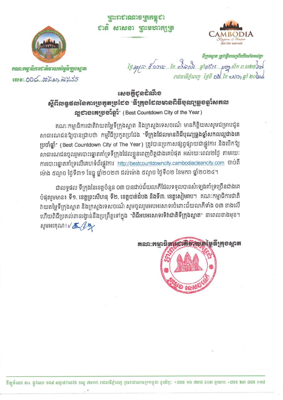 គណៈកម្មាធិការជាតិវាយតម្លៃទីក្រុងស្អាត និងក្រសួងទេសចរណ៍ បានរៀបចំកម្មវិធីប្រកួតប្រជែង «ទីក្រុងដែលមានពិធីបុណ្យឆ្លងឆ្នាំសកលល្អជាងគេប្រចាំឆ្នាំ» (Best Countdown City of The Year) ត្រូវបានប្រកាសផ្សព្វផ្សាយជាផ្លូវការ និងបើកឲ្យសាធារណជនចូលរួមបោះឆ្នោត គាំទ្រទីក្រុងដែលខ្លួនពេញចិត្តជាងគេបំផុត អស់រយៈពេល២ថ្ងៃ តាមរយៈការបោះឆ្នោតគាំទ្រលើគេហទំព័រផ្លូវការ http://bestcountdowncity.cambodiacleancity.com ចាប់ពីម៉ោង៥ល្ងាច ថ្ងៃទី៣១ ខែធ្នូ ឆ្នាំ២០២៣ ដល់ម៉ោង៥ល្ងាច ថ្ងៃទី០២ ខែមករា ឆ្នាំ២០២៤។