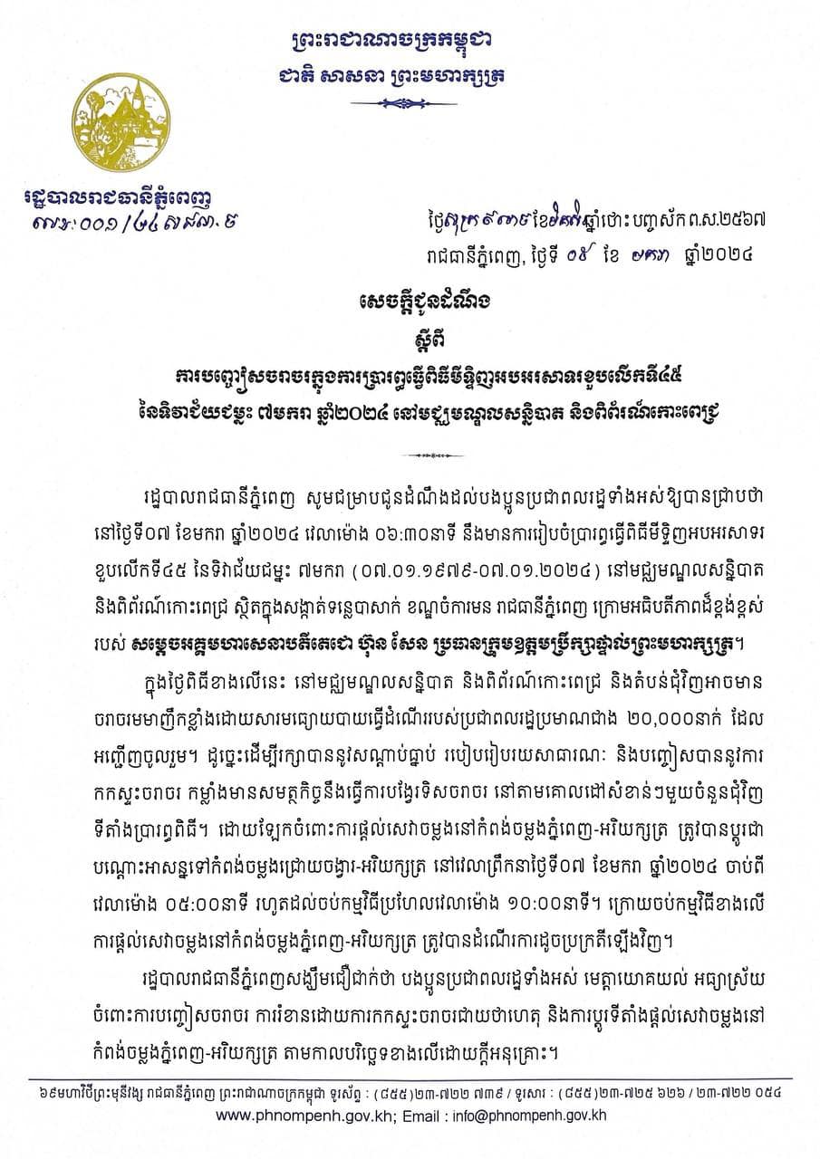 រាជធានីភ្នំពេញ៖ យោងតាមការចុះផ្សាយរបស់ រដ្ឋបាលរាជធានីភ្នំពេញ បានចេញសេចក្ដីជូនដំណឹង ស្ដីពីការបញ្ចៀសចរាចរក្នុងការប្រារព្ធធ្វើពិធីមីទ្ទិញអបអរសាទរខួបលើកទី៤៥ នៃទិវាជ័យជម្នះ ៧មករា ឆ្នាំ២០២៤ នៅមជ្ឈមណ្ឌលសន្និបាត និងពិព័រណ៍កោះពេជ្រ។