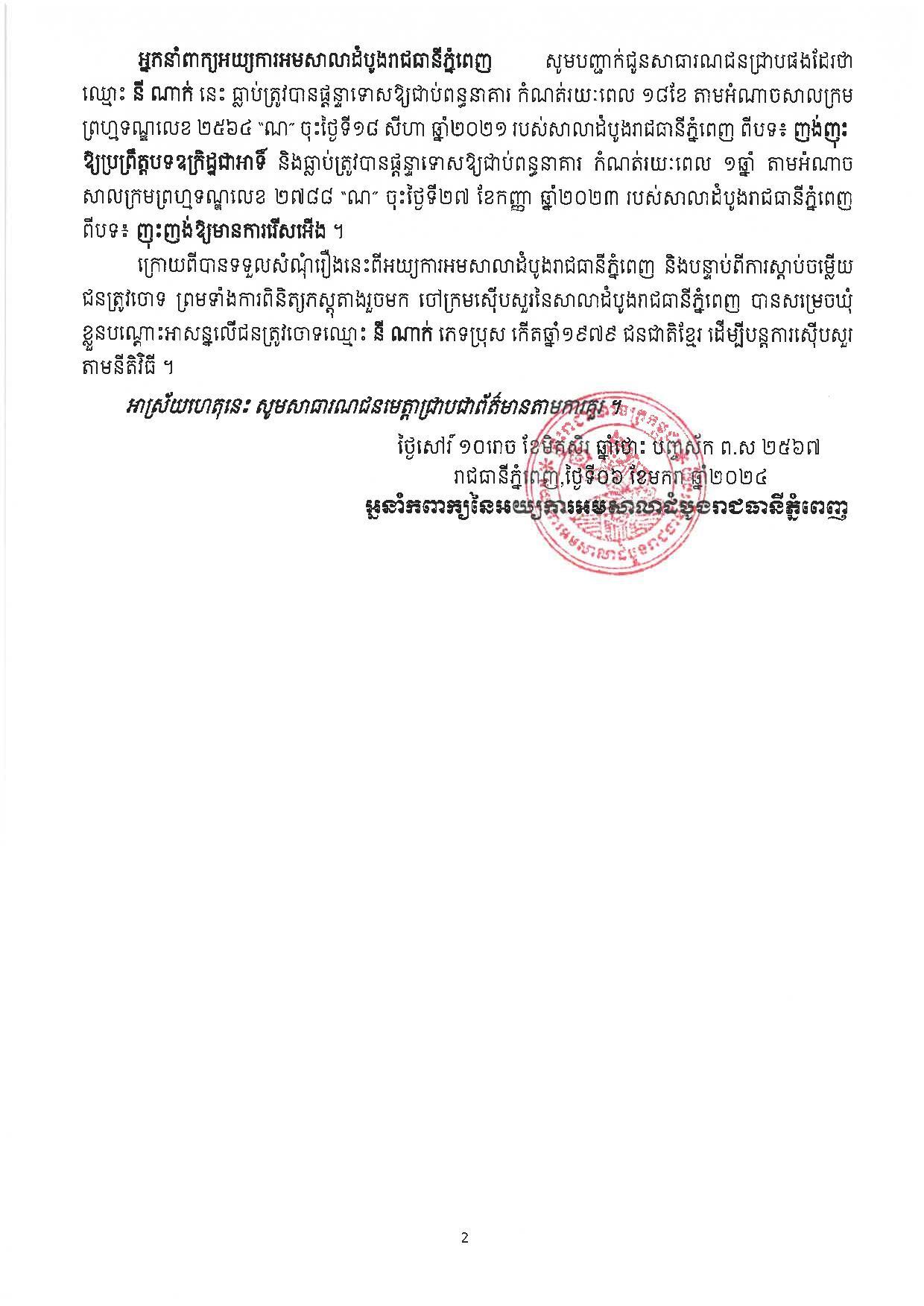 អ្នកនាំពាក្យនៃអយ្យការអមសាលាដំបូងរាជធានីភ្នំពេញ ចេញសេចក្តីប្រកាសពាក់ព័ន្ធនឹងសំណុំរឿងព្រហ្មទណ្ឌ សង្ស័យឈ្មោះ នី ណាក់ ពីបទបរិហាកេរ្តិ៍ជាសាធារណៈ និងញុះញង់ឱ្យមានការរើសអើង