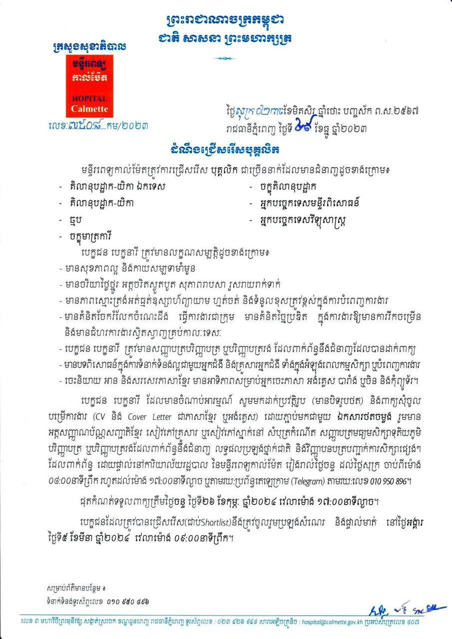 មន្ទីរពេទ្យកាល់ម៉ែតត្រូវការជ្រើសរើស បុគ្គលិក ជាច្រើននាក់ដែលមានជំនាញដូចខាងក្រោម៖