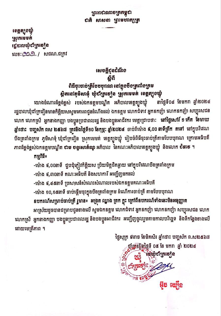 រដ្ឋបាលឃុំជាំក្រវៀន មានកិត្តិយសសូមគោរពជូនដំណឹងដល់ ឯកឧត្តម លោកជំទាវ អ្នកឧកញ៉ា លោកឧកញ៉ា សប្បុរសជន លោក លោកស្រី អ្នកនាងកញ្ញា បងប្អូនប្រជាពលរដ្ឋ និងបងប្អូនអាជីវករ មេត្តាជ្រាបថា៖ នៅថ្ងៃសៅរ៍ ១ កើត ខែមាឃ ឆ្នាំថោះ បញ្ចស័ក ព.ស ២៥៦៧ ត្រូវនឹងថ្ងៃទី១០ ខែកុម្ភៈ ឆ្នាំ២០២៤ ចាប់ពីម៉ោង ៩៖០០ នាទីព្រឹក តទៅ នៅក្នុបរិវេណ បឹងត្រពាំងក្រម ភូមិសាទុំ ឃុំជាំក្រវៀន ស្រុកមេមត់ ខេត្តត្បូងឃ្មុំ រៀបចំពិធីចុះចាប់ត្រីតាមបែបបុរាណ ក្រោមអធិបតី ភាពដ៏ខ្ពង់ខ្ពស់ឯកឧត្តមបណ្ឌិត ជាម ចន្ទសោភ័ណ្ឌ អភិបាល នៃគណៈអភិបាលខេត្តត្បូងឃ្មុំ និងលោក ជំទាវ ។
