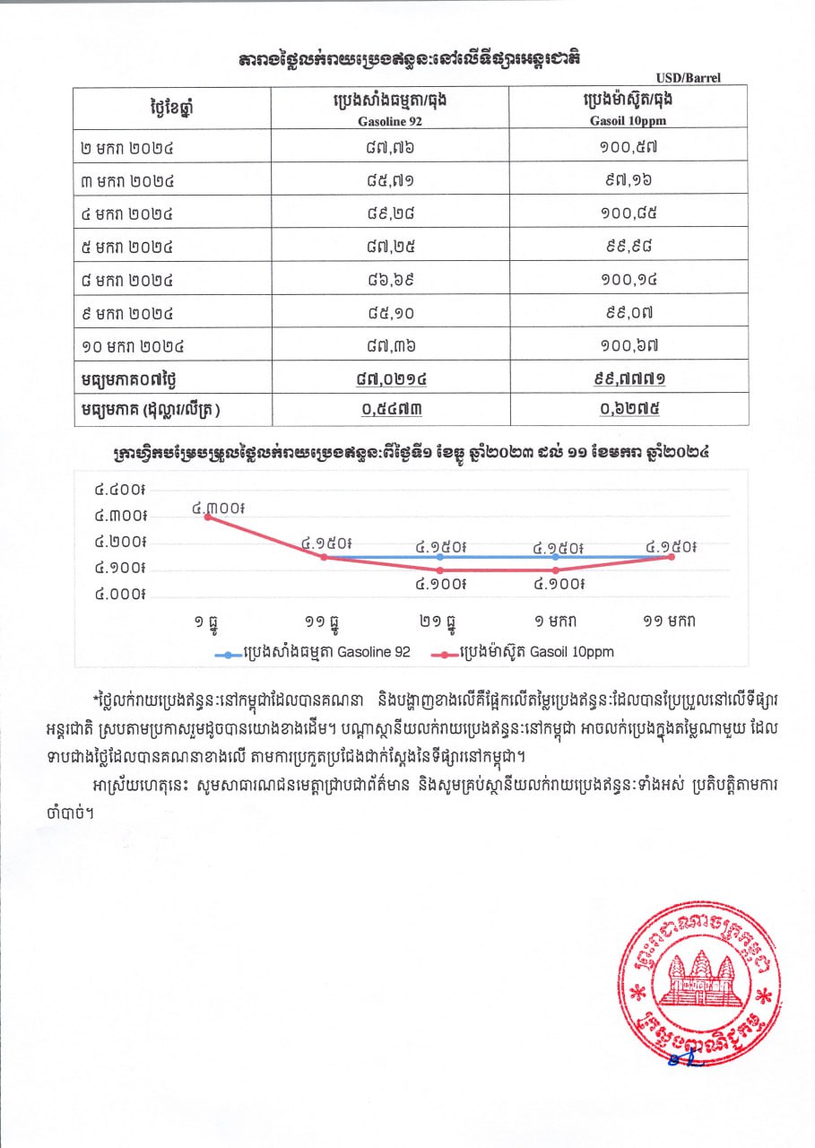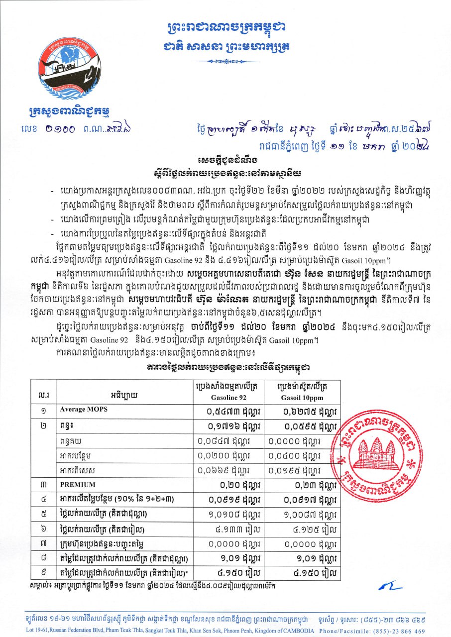 មកដឹងពីតម្លៃលក់រាយប្រេងសាំងថ្មី ចាប់ពីថ្ងៃទី១១ ដល់ថ្ងៃទី២០ ខែមករា ឆ្នាំ២០២៤
