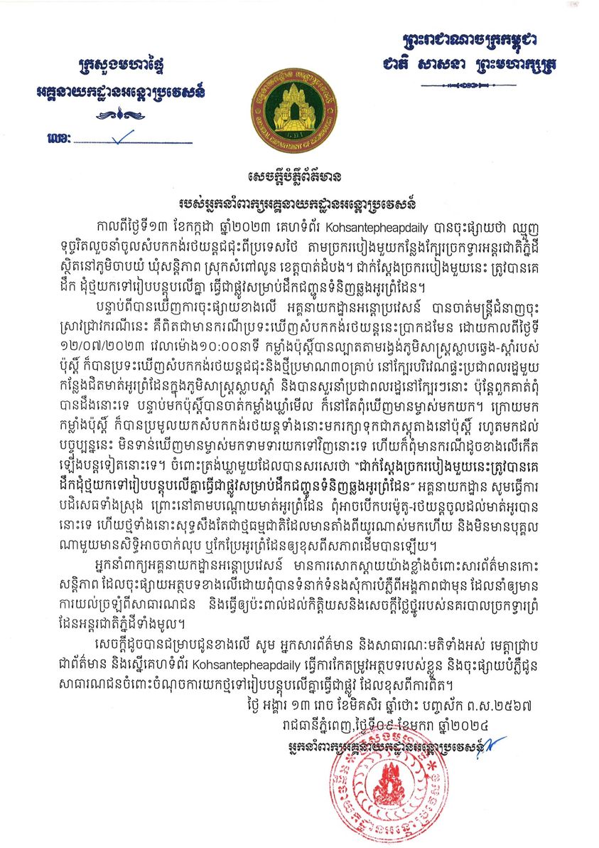 អ្នកនាំពាក្យអគ្គនាយកដ្ឋានអន្តោប្រវេសន៍ មានការសោកស្តាយយ៉ាងខ្លាំងចំពោះសារព័ត៌មានក្នុងស្រុក ដែលចុះផ្សាយអត្ថបទខាងលើដោយពុំបានទំនាក់ទំនងសុំការបំភ្លឺពីអង្គភាពជាមុន ដែលនាំឲ្យមានការយល់ច្រឡំពីសាធារណជន និងធ្វើឲ្យប៉ះពាល់ដល់កិត្តិយសនិងសេចក្តីថ្លៃថ្នូររបស់នគរបាលច្រកទ្វារព្រំ ដែនអន្តរជាតិភ្នំដីទាំងមូល៕