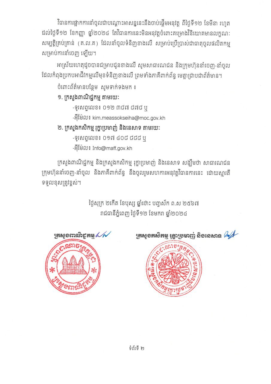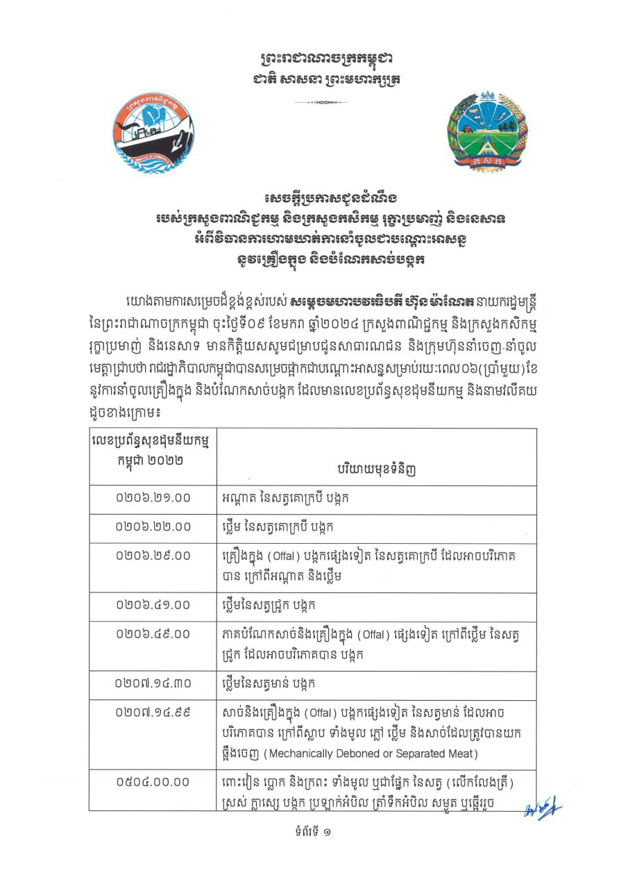 យោងតាមការសម្រេចដ៏ខ្ពង់ខ្ពស់របស់សម្តេចមហាបវធិបតី ហ៊ុនម៉ាណែត នាយករដ្ឋមន្ត្រី នៃកម្ពុជា ចុះថ្ងៃទី០៩ ខែមករា ឆ្នាំ២០២៤ ក្រសួងពាណិជ្ជកម្ម និងក្រសួងកសិកម្ម រុក្ខាប្រមាញ់ និងនេសាទ សូមជម្រាបជូនសាធារណជន និងក្រុមហ៊ុននាំចេញ-នាំចូល មេត្តាជ្រាបថា រាជរដ្ឋាភិបាលកម្ពុជាបានសម្រេចផ្អាកជាបណ្តោះអាសន្នសម្រាប់រយៈពេល ០៦ (ប្រាំមួយ)ខែ នូវការនាំចូលគ្រឿងក្នុង និងបំណែកសាច់បង្កក ដែលមានលេខប្រព័ន្ធសុខដុមនីយកម្ម និងនាមវលីគយ ដូចមានក្នុងសេចក្តីប្រកាសនេះ។