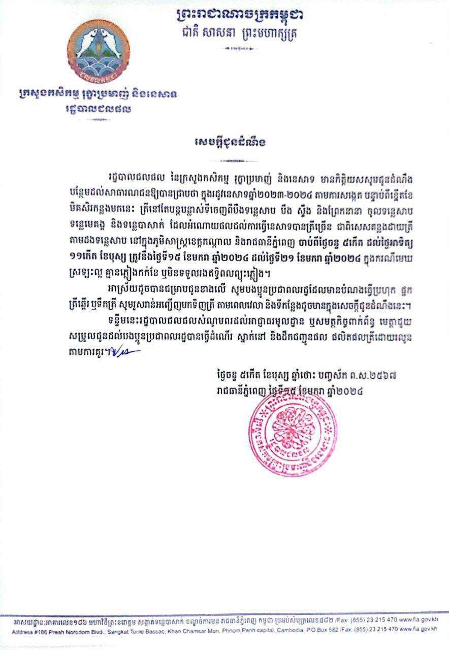 រដ្ឋបាលជលផល សូមជូនដំណឹង បន្ថែមដល់សាធារណជនឱ្យបានជ្រាបថា ក្នុងរដូវនេសាទឆ្នាំ២០២៣-២០២៤ តាមការសង្កេត បន្ទាប់ពីខ្នើតខែ មិគសិរកន្លងមកនេះ ត្រីនៅតែបន្តបន្លាស់ទីចេញពីបឹងទន្លេសាប បឹង ស្ទឹង និងព្រែកនានា ចូលទន្លេសាប ទន្លេមេគង្គ និងទន្លេបាសាក់ ដែលអំណោយផលដល់ការធ្វើនេសាទបានត្រីច្រើន ជាពិសេសគន្លងដោយត្រី តាមដងទន្លេសាប នៅក្នុងភូមិសាស្ត្រខេត្តកណ្តាល និងរាជធានីភ្នំពេញ ចាប់ពីថ្ងៃចន្ទ ៥កើត ដល់ថ្ងៃអាទិត្យ ១១កើត ខែបុស្ស ត្រូវនឹងថ្ងៃទី១៥ ខែមករា ឆ្នាំ២០២៤ ដល់ថ្ងៃទី២១ ខែមករា ឆ្នាំ២០២៤ ក្នុងករណីមេឃ ស្រឡះល្អ គ្មានភ្លៀងកក់ខែ ឬមិនទទួលរងឥទ្ធិពលព្យុះភ្លៀង។