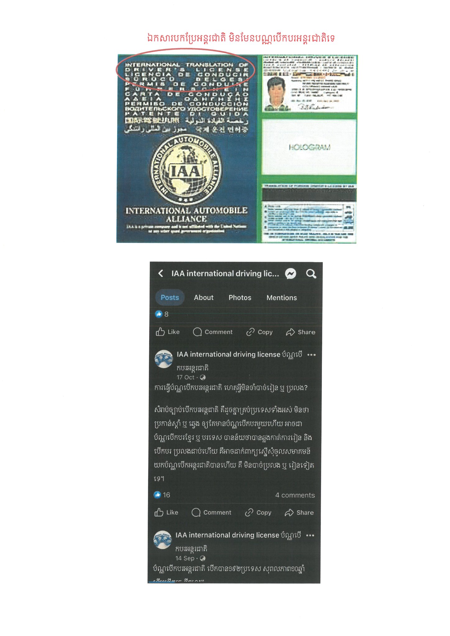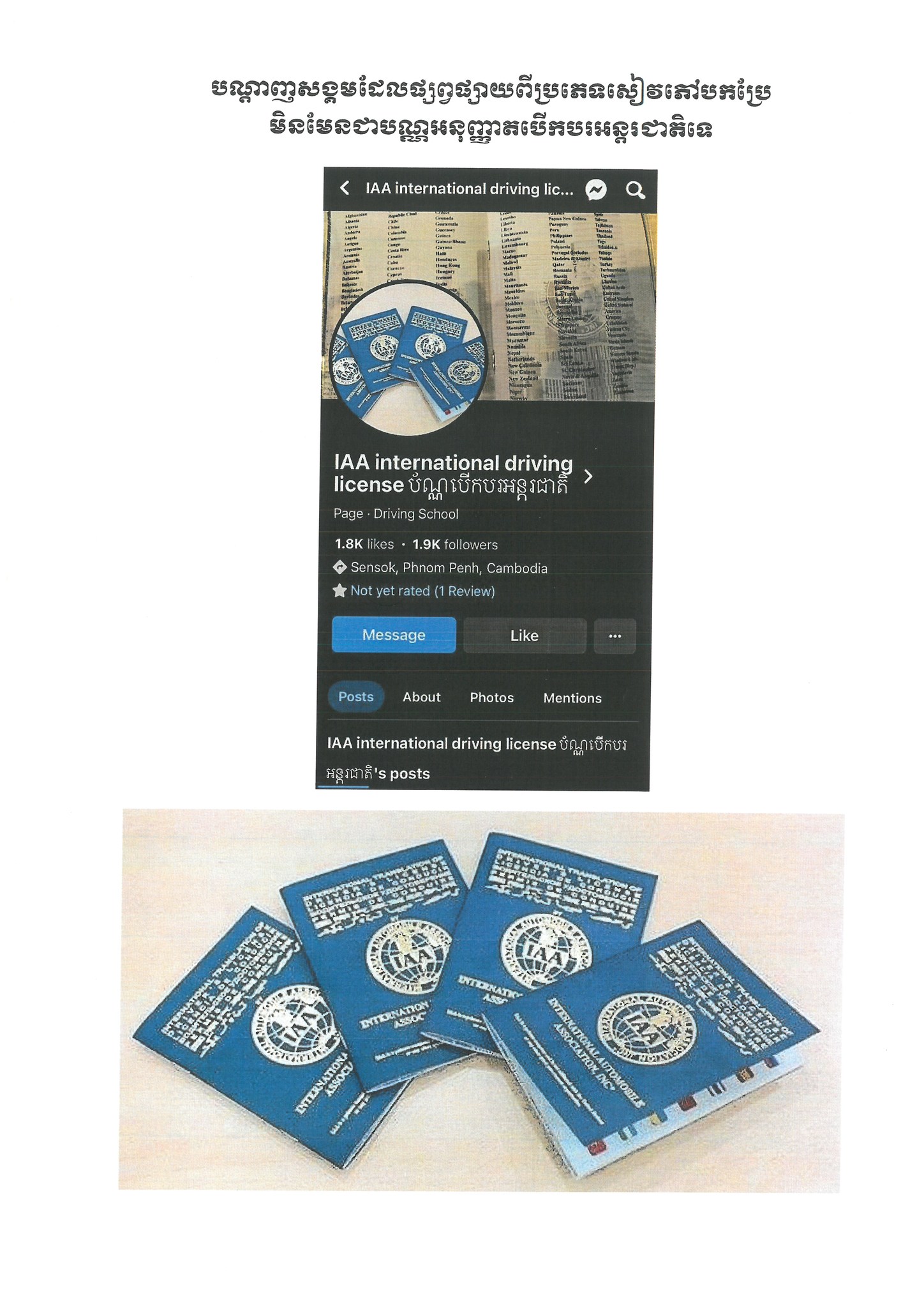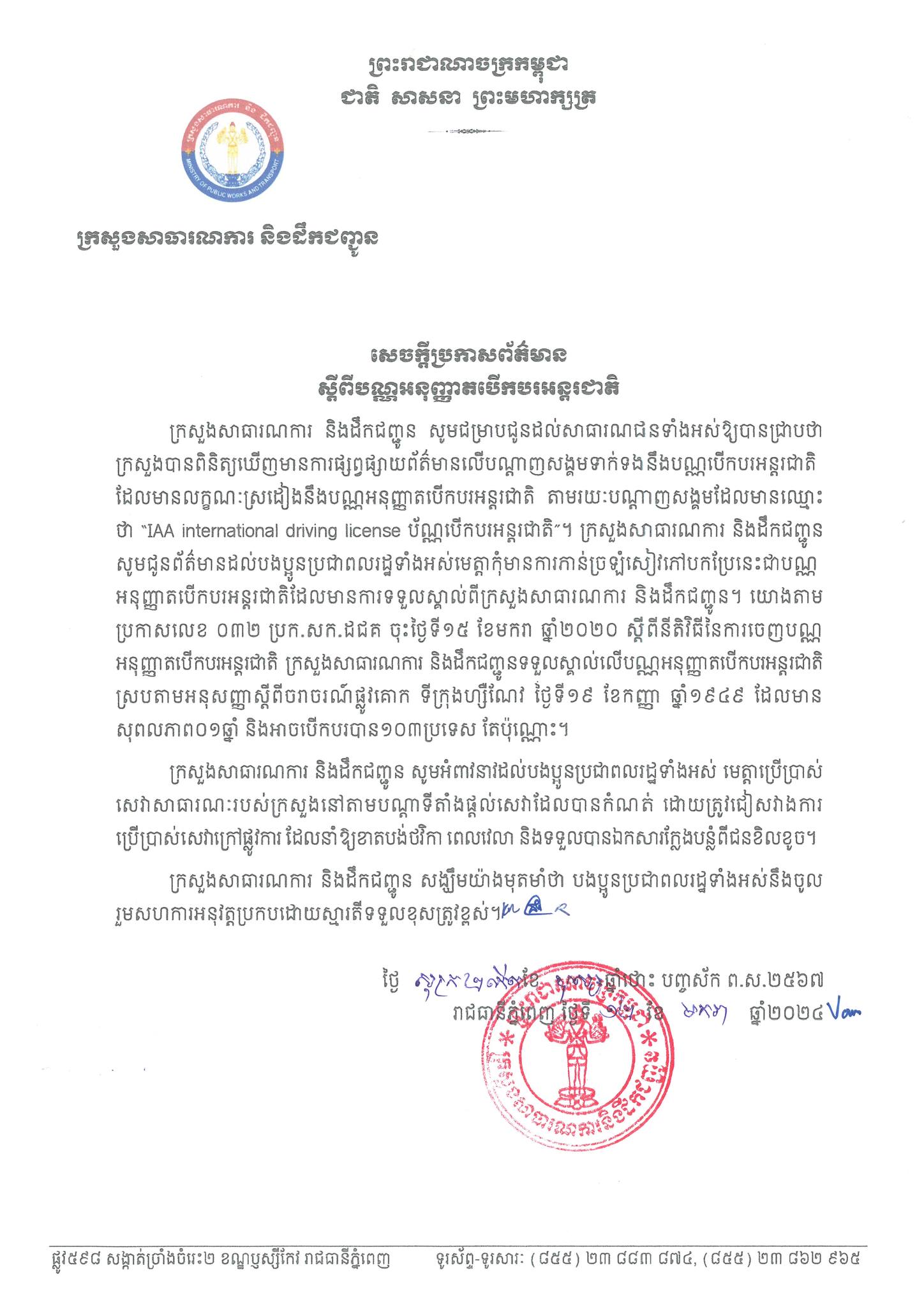 ក្រសួងសាធារណការ ក្រោយពិនិត្យឃើញមានការផ្សព្វផ្សាយព័ត៌មានលើបណ្ដាញសង្គមទាក់ទងនឹងបណ្ណបើកបរអន្តរជាតិ ដែលមានលក្ខណៈស្រដៀងនឹងបណ្ណអនុញ្ញាតបើកបរអន្តរជាតិ តាមរយៈបណ្ដាញសង្គមដែលមានឈ្មោះ ថា «IAA international driving license ប័ណ្ណបើកបរអន្តរជាតិ» ក្រសួងសាធារណការ និងដឹកជញ្ជូន បានចេញសេចក្តីប្រកាសព័ត៌មានបន្ថែមជូនដល់ប្រជាពលរដ្ឋទាំងអស់ មេត្តាកុំមានការភាន់ច្រឡំសៀវភៅបកប្រែនេះ ជាបណ្ណអនុញ្ញាតបើកបរអន្តរជាតិ ដែលមានការទទួលស្គាល់ពីក្រសួងសាធារណការ និងដឹកជញ្ជូន។