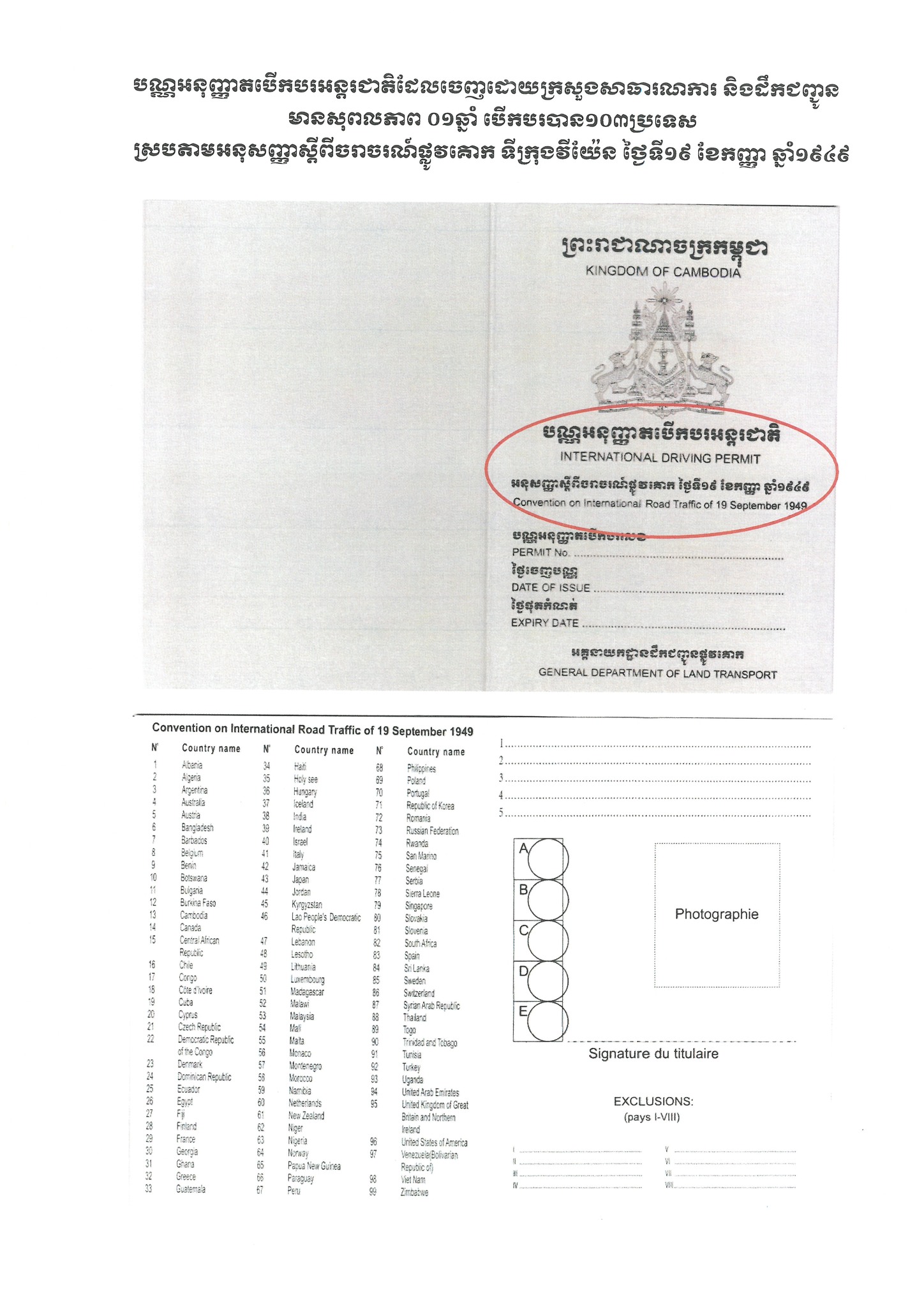 សេចក្តីប្រកាសព័ត៌មានរបស់ក្រសួងសាធារណការ និងដឹកជញ្ជូន ដែលបណ្តាញព័ត៌មាន Fresh News ទទួលបាននៅរសៀលថ្ងៃទី១៥ ខែមករា ឆ្នាំ២០២៤នេះ ក្រសួងបានបញ្ជាក់ទៀតថា យោងតាមប្រកាសលេខ ០៣២ ប្រក.សក.ដជគ ចុះថ្ងៃទី១៥ ខែមករា ឆ្នាំ២០២០ ស្ដីពីនីតិវិធីនៃការចេញបណ្ណ អនុញ្ញាតបើកបរអន្តរជាតិ ក្រសួងសាធារណការ និងដឹកជញ្ជូនទទួលស្គាល់លើបណ្ណអនុញ្ញាតបើកបរអន្តរជាតិ ស្របតាមអនុសញ្ញាស្ដីពីចរាចរណ៍ផ្លូវគោក ទីក្រុងហ្សឺណែវ ថ្ងៃទី១៩ ខែកញ្ញា ឆ្នាំ១៩៤៩ ដែលមាន សុពលភាព០១ឆ្នាំ និងអាចបើកបរបាន១០៣ប្រទេស តែប៉ុណ្ណោះ។