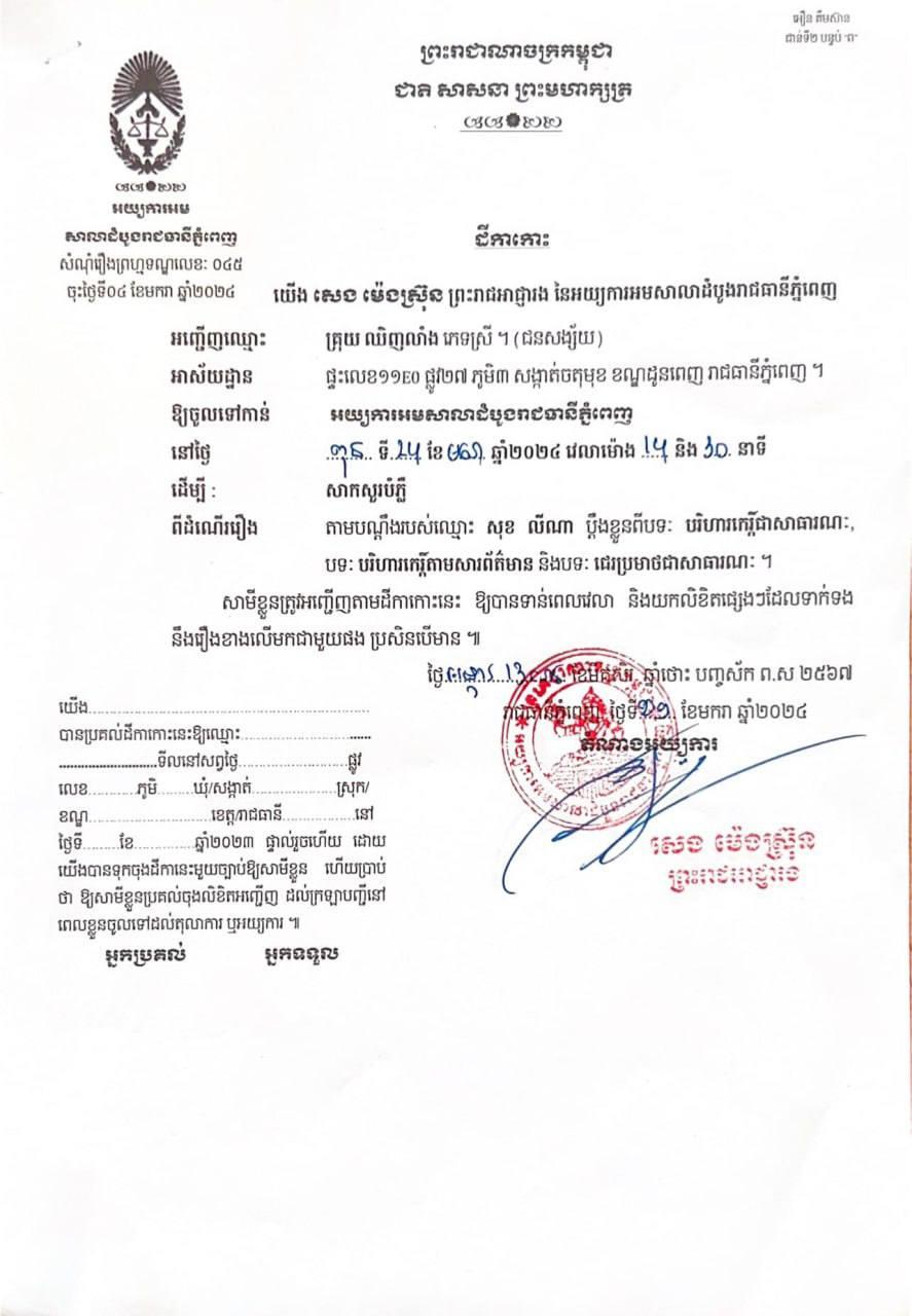 គួរជម្រាបជូនថា នៅថ្ងៃទី១៦ ខែមករា ឆ្នាំ២០២៤ម្សិលមិញនេះ ផ្ទុះការរិះគន់ យ៉ាងព្រោងព្រាត បន្ទាប់ពីម្ដាយជនបង្កឈ្មោះ សុខ លីណា ប្ដឹងប្រពន្ធជនរងគ្រោះ និងសាច់ញាតិជនរងគ្រោះមួយចំនួនទៀត ពីបទ បរិហារកេរ្តិ៍តាមសារព័ត៌មាន, បទ ជេរប្រមាថជាសាធារណៈនិងបទ បរិហារកេរ្តិ៍ជាសាធារណៈ។