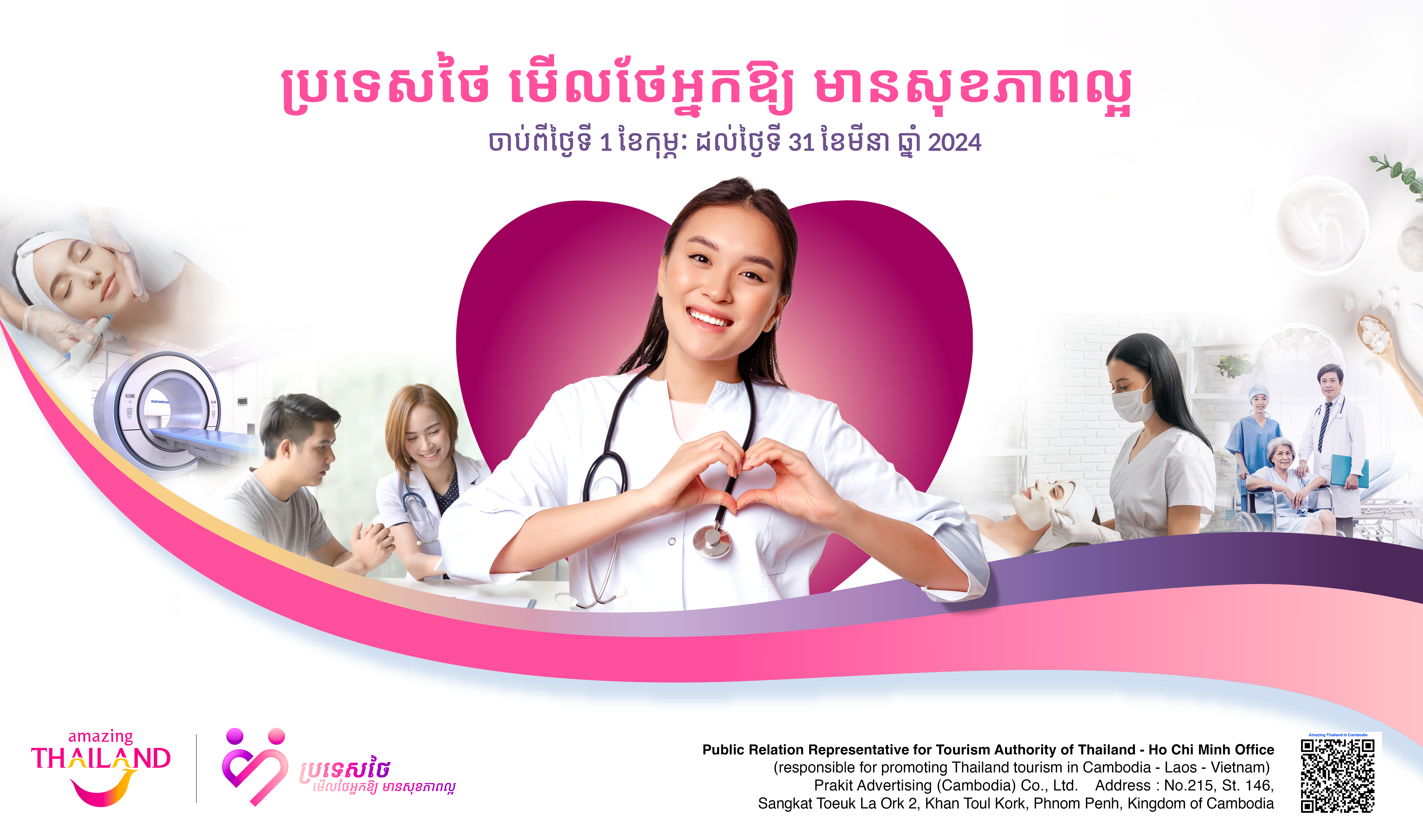 “ប្រទេសថៃ មើលថែអ្នកឲ្យ មានសុខភាពល្អ” គឺជាយុទ្ធនាការដំបូងរបស់អាជ្ញាធរទេសចរណ៍នៃប្រទេសថៃ សហការជាមួយមន្ទីរពេទ្យ និងកន្លែងថែទាំសុខភាព ដើម្បីបង្ហាញជូននូវកាដូពិសេសនៃការថែទាំសុខភាព និងសម្រស់ប្រចាំខែកុម្ភៈដែលជាខែនៃការបង្ហាញសេចក្តីស្រលាញ់ ចាប់ពីថ្ងៃទី 1 ខែកុម្ភៈ ដល់ថ្ងៃទី 31 ខែមីនា ឆ្នាំ 2024។ កិច្ចខិតខំប្រឹងប្រែងផ្សព្វផ្សាយរួមគ្នាពាក់ព័ន្ធនឹងសាជីវកម្មដែលសហការជាមួយមន្ទីរពេទ្យ និងអាជីវកម្មសុខភាពកំពូលទាំង 12 របស់ប្រទេសថៃ ដើម្បីផ្តល់នូវការបញ្ចុះតម្លៃពិសេសទាំង 12 កញ្ចប់នៃអត្ថប្រយោជន៍សុខភាព និងសម្រស់។ កញ្ចប់សេវាកម្មនេះផ្តល់អត្ថប្រយោជន៍ដល់អ្នកដំណើរកម្ពុជាដែលខ្វល់ខ្វាយអំពីបញ្ហាសុខភាព និងសម្រស់ ហើយចង់ចែករំលែកការថែទាំជាមួយមនុស្សជាទីស្រលាញ់ផងដែរ។ កម្មវិធីពិនិត្យសុខភាពតាមកញ្ចប់ផ្សេងៗគ្នា ការព្យាបាលវេជ្ជសាស្ត្រជាក់លាក់ជាមួយឧបករណ៍ទំនើបៗ សេវាកម្មសុខភាពសម្រស់ និងស្ប៉ា ជាដើម។ សម្រាប់កញ្ចប់សេវាកម្មពិសេសទាំង ១២ ប្រភេទពីសំណាក់មន្ទីរពេទ្យល្បីៗទាំង ១២កន្លែងមកពីប្រទេសថៃផ្ទាល់រួមមាន៖