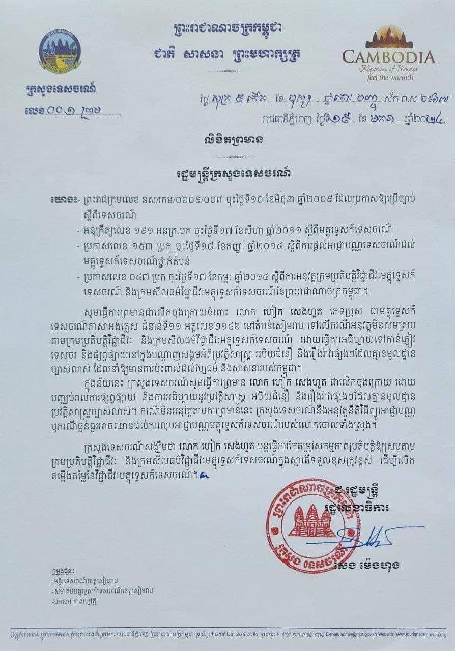 ក្រសួងទេសចរណ៍ ព្រមានជាលើកចុងក្រោយចំពោះលោក ហៀក សេងហួត ដែលមិនអនុវត្តតាមក្រមសីលធម៌វិជ្ជាជីវៈមគ្គុទេសក៍ទេសចរណ៍
