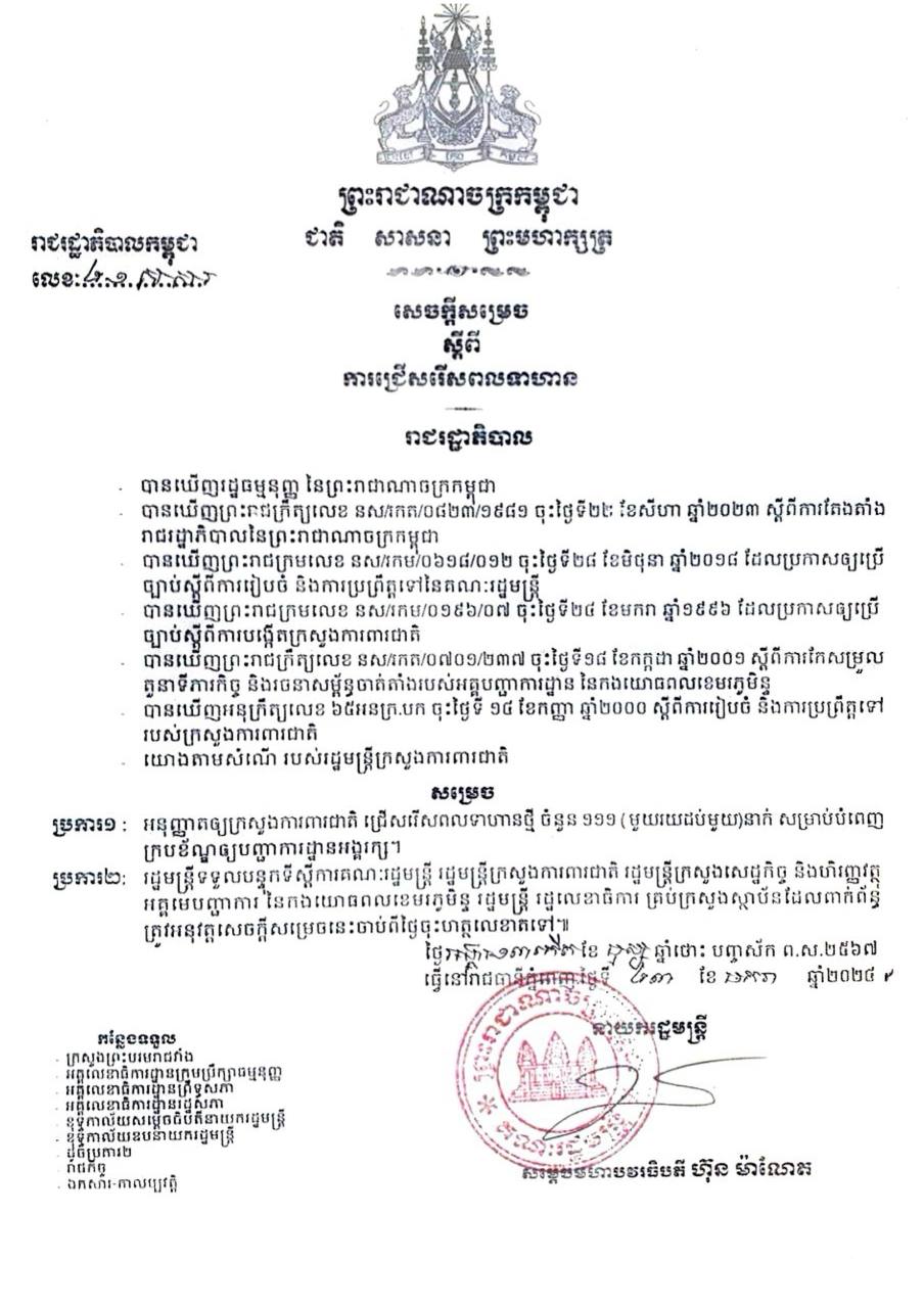 រាជរដ្ឋាភិបាលកម្ពុជា អនុញ្ញាតឲ្យក្រសួងការពារជាតិ ជ្រើសរើសពលទាហានថ្មី ចំនួន ១១១ (មួយរយដប់មួយ)នាក់ សម្រាប់បំពេញ ក្របខ័ណ្ឌឲ្យបញ្ជាការដ្ឋានអង្គរក្ស។