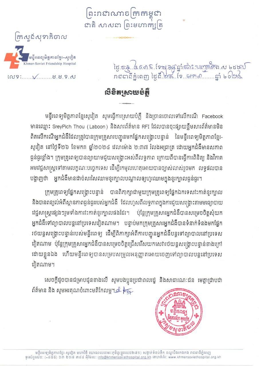 រាជធានីភ្នំពេញ៖ នៅថ្ងៃទី៣០ ខែមករា ឆ្នាំ២០២៤ យោងតាមការចុះផ្សាយរបស់ មន្ទីរពេទ្យមិត្តភាពខ្មែរ-សូវៀត បានចេញលិខិតស្រាយបំភ្លឺ និងច្រានចោលទៅលើករណី Facebook មានឈ្មោះ SreyPich Thou (Laboon) និងសារព័ត៌មានក្នុងស្រុកមួយ ដែលបានចុះផ្សាយខ្លឹមសារព័ត៌មានមិនពិតលើករណីអ្នកជំងឺម្នាក់ ត្រូវបានក្រុមគ្រួសារបញ្ចូនមកផ្នែកសង្គ្រោះបន្ទាន់ នៃមន្ទីរពេទ្យមិត្តភាពខ្មែរ-សូវៀត នៅថ្ងៃទី២៦ ខែមករា ឆ្នាំ២០២៤ វេលាម៉ោង ២៖៣៧ រំលងអធ្រាត្រ ដោយអ្នកជំងឺមានសភាពធ្ងន់ធ្ងរខ្លាំង។