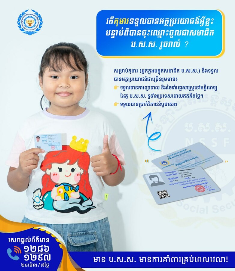 ឯកឧត្តមពន្យល់ថា កុមារ (អ្នកក្នុងបន្ទុកសមាជិក ប.ស.ស.) ទទួលបានអត្ថប្រយោជន៍ដូចជាការព្យាបាល និងថែទាំវេជ្ជសាស្ត្រ ដោយឥតគិតថ្លៃនៅគ្រប់មន្ទីរពេទ្យដៃគូ ប.ស.ស. ទូទាំងប្រទេស ទាំងមន្ទីពេទ្យសាធារណ និងឯកជន ក្នុងនោះដែរប្រសិនបើកុមារជួបគ្រោះថ្នាក់ និងជំងឺជាអកុសលរហូតដល់ស្លាប់បាត់បង់ជីវិតបេឡាជាតិសន្តិសុខសង្គម នៃក្រសួងការងារនឹងផ្តល់ប្រាក់វិភាជន៍បូជាសព។