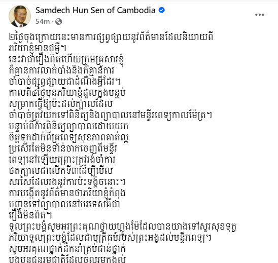 តាមរយៈបណ្តាញសង្គមហ្វេសប៊ុក សម្តេចតេជោ បានលើកឡើងថា « ២ថ្ងៃចុងក្រោយនេះមានការផ្សព្វផ្សាយនូវព័ត៌មានដែលនិយាយពី ភរិយាខ្ញុំមានជម្ងឺ។ នេះវាជារឿងពិតហើយក្រុមគ្រួសារខ្ញុំ ក៏គ្មានការលាក់បាំងនិងក៏គ្មានការ ចាំបាច់ផ្សព្វផ្សាយជាដំណឹងអ្វីដែរ។