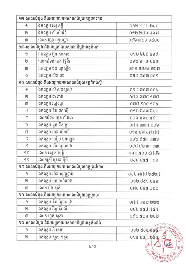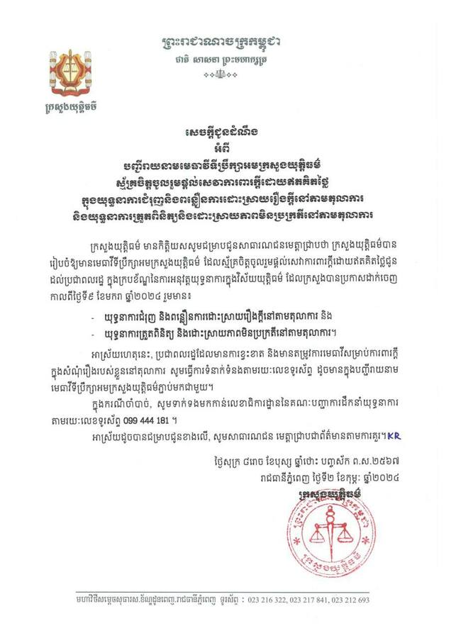 រាជធានីភ្នំពេញ៖ នៅថ្ងៃទី០៣ ខែកុម្ភៈ ឆ្នាំ២០២៤ យោងតាមការចុះផ្សាយរបស់ ក្រសួងព័ត៌មាន បានឱ្យដឹងថា ក្រសួងយុត្តិធម៌ បានបង្ហាញជូននូវបញ្ជីឈ្មោះមេធាវីទីប្រឹក្សាអមក្រសួងយុត្តិធម៌ស្ម័គ្រចិត្ត ដែលផ្តល់សេវាការពារក្តីដោយឥតគិតថ្លៃក្នុងយុទ្ធនាការជំរុញនិងពន្លឿនការដោះស្រាយរឿងក្តីនៅតាមតុលាការ និងយុទ្ធនាការត្រួតពិនិត្យនិងដោះស្រាយភាពមិនប្រក្រតីនៅតាមតុលាការ។