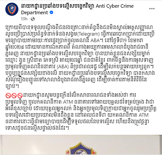 រាជធានីភ្នំពេញ៖ នៅថ្ងៃទី០៤ ខែកុម្ភៈ ឆ្នាំ២០២៤ យោងតាមការចុះផ្សាយរបស់ នាយកដ្ឋានប្រឆាំងបទល្មើសបច្ចេកវិទ្យា បានឱ្យដឹងថា ក្រោយពីបានទទួលបណ្តឹងពីជនរងគ្រោះពាក់ព័ន្ធនឹងជនមិនស្គាល់អត្តសញ្ញាណ លួចប្រើប្រាស់ប្រព័ន្ធទំនាក់ទំនងសង្គម(Telegram) ធ្វើការឆបោកប្រាក់ដោយប្រើមធ្យោបាយតាមរយៈការផ្ទេរប្រាក់ចូលគណនី ABA។
