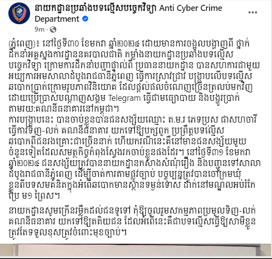 រាជធានីភ្នំពេញ៖ យោងតាមការចុះផ្សាយរបស់ នាយកដ្ឋានប្រឆាំងបទល្មើសបច្ចេកវិទ្យា បានឱ្យដឹងថា នៅថ្ងៃទី៣០ ខែមករា ឆ្នាំ២០២៤ ដោយមានការចង្អុលបង្ហាញពី ថ្នាក់ដឹកនាំអគ្គស្នងការដ្ឋាននគរបាលជាតិ កម្លាំងនាយកដ្ឋានប្រឆាំងបទល្មើសបច្ចេកវិទ្យា ក្រោមការដឹកនាំបញ្ជាផ្ទាល់ពី ប្រធាននាយកដ្ឋាន បានសហការជាមួយអយ្យការអមសាលាដំបូងរាជធានីភ្នំពេញ ធ្វើការស្រាវជ្រាវ បង្ក្រាបលើបទល្មើសឆបោកប្រាក់ក្រោមរូបភាពវិនិយោគ ដែលផ្តល់ផលចំណេញច្រើនត្រលប់មកវិញ ដោយប្រើប្រាស់បណ្តាញសង្គម Telegram ធ្វើជាមធ្យោបាយ និងបង្ហូរប្រាក់តាមរយៈគណនីធនាគារនៅកម្ពុជា។