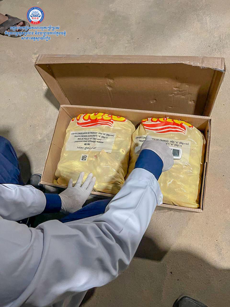 ជើងមាន់បង្កកទាំងអស់នោះ ត្រូវបានសមត្ថកិច្ចជំនាញឃាត់ចាប់បានលើរថយន្តដឹក កុងទឺនឺ (Container) ចំនួន ៤គ្រឿង សំដៅឆ្ពោះទៅស្រុករមាសហែកក្នុងគោលបំណងធ្វើការចែកចាយបន្ត។ សូមបញ្ជាក់ថាជើងមាន់បង្កកទាំងអស់ខាងលើត្រូវបានមន្រ្តីជំនាញ រកឃើញថាពុំមានច្បាប់អនុញ្ញាត ពុំមានឯកសារបញ្ជាក់ពីគុណភាព ពិសេសគឺពុំមានអនាម័យ និងផ្ទុកនូវសីតុណ្ហភាពពុំត្រឹមត្រូវតាមស្ដង់ដារ ដែលបណ្ដាលឱ្យខូចគុណភាពប៉ះពាល់សុខភាពអ្នកបរិភោគយ៉ាងធ្ងន់ធ្ងរ ៕